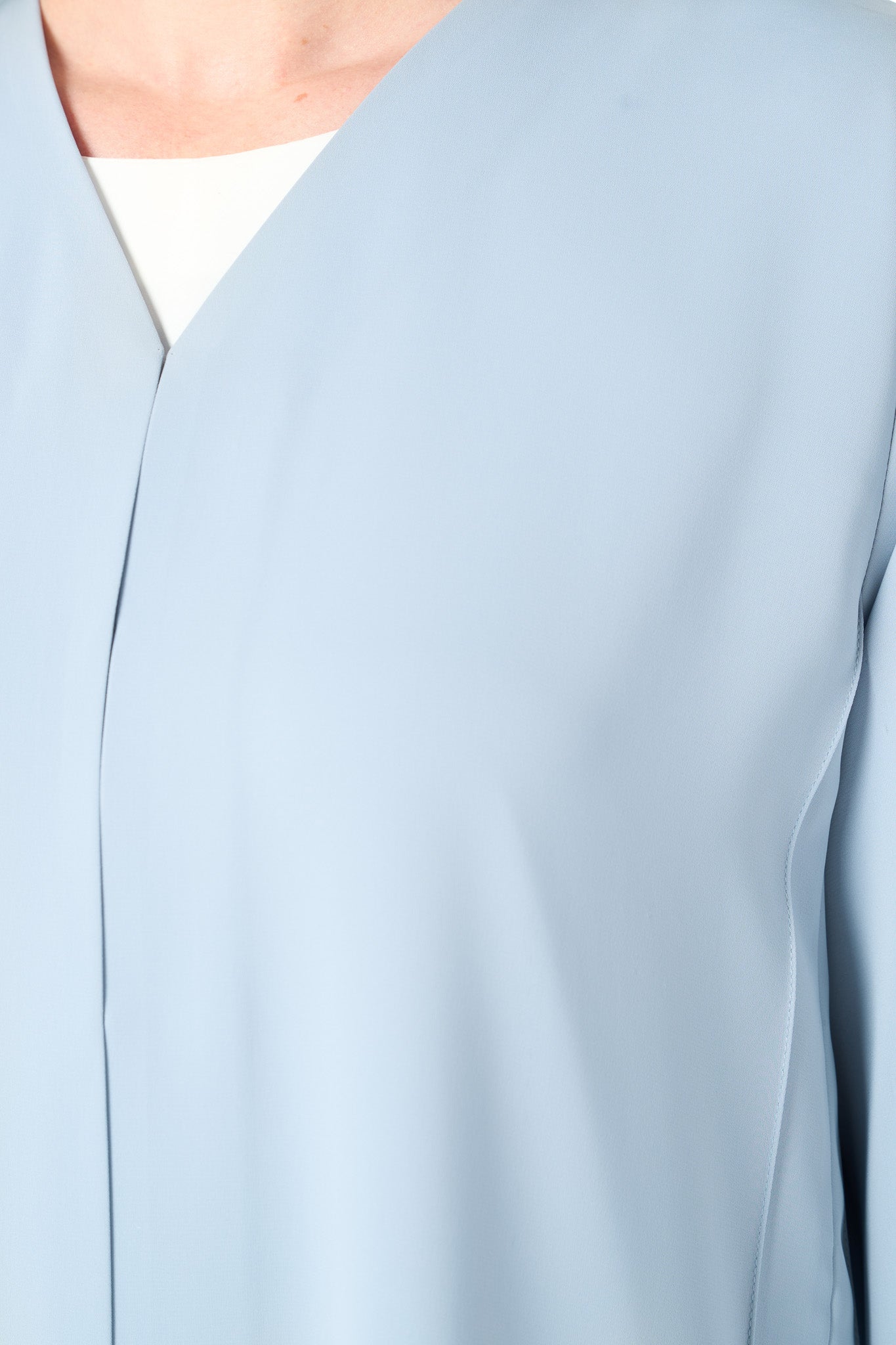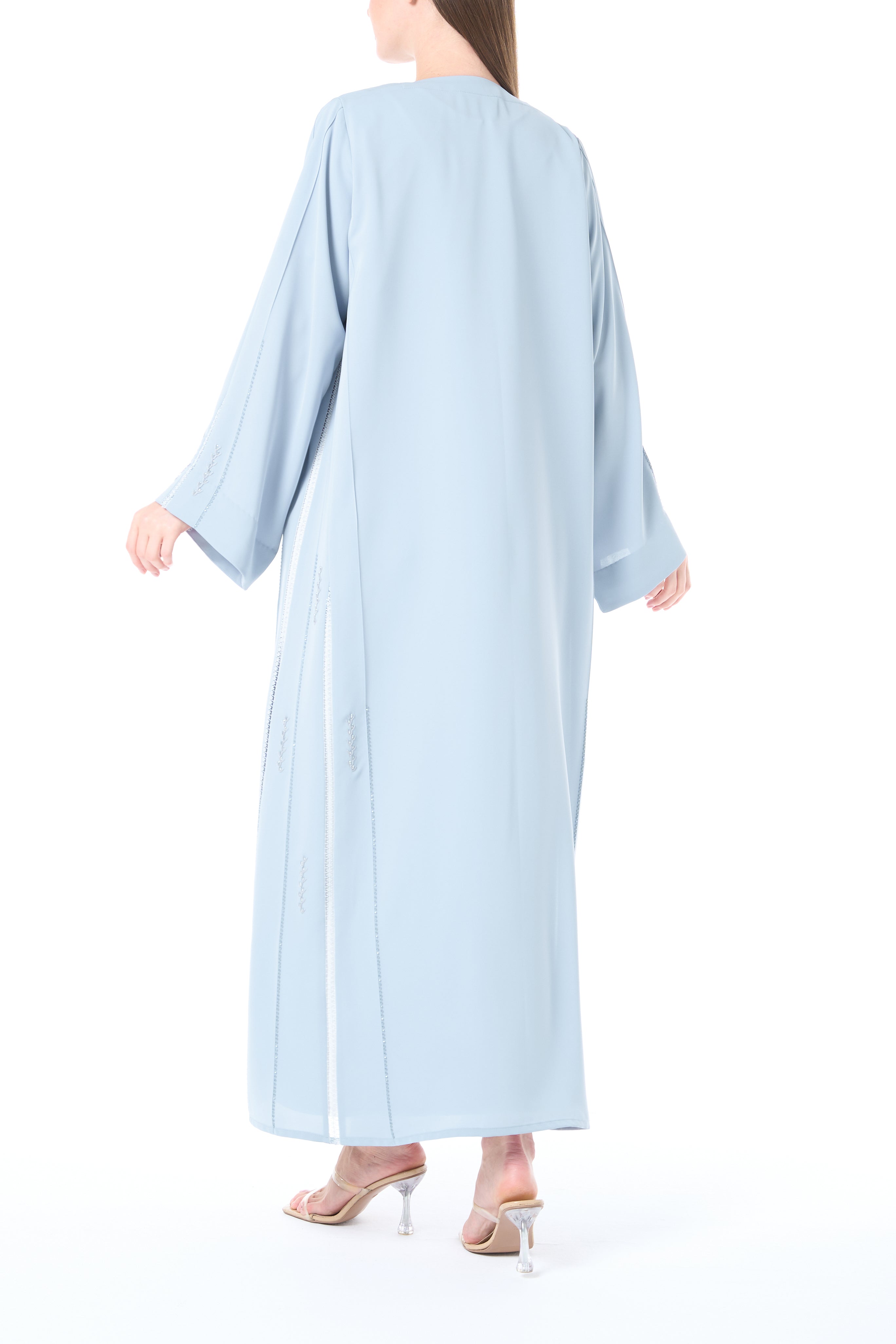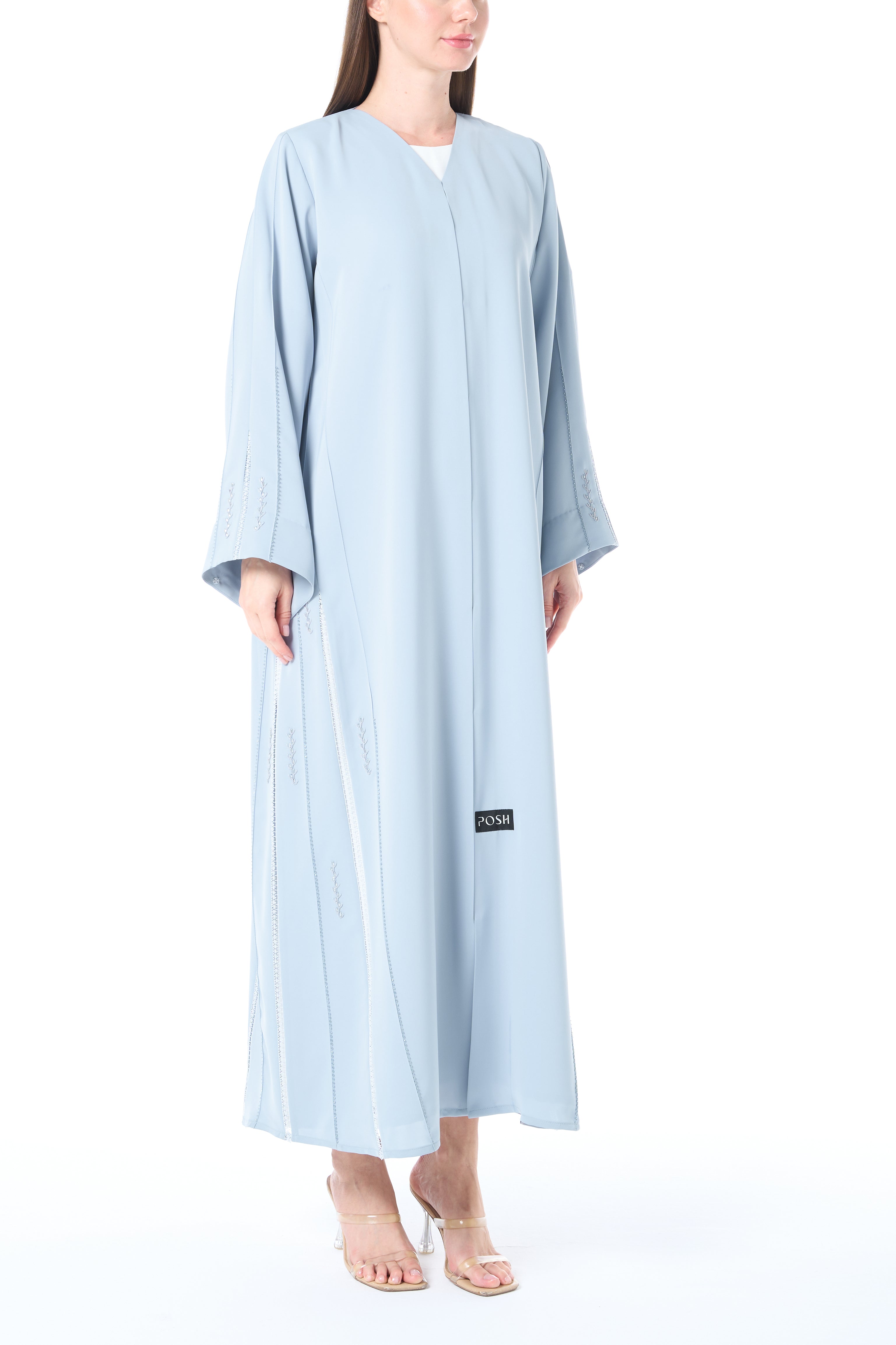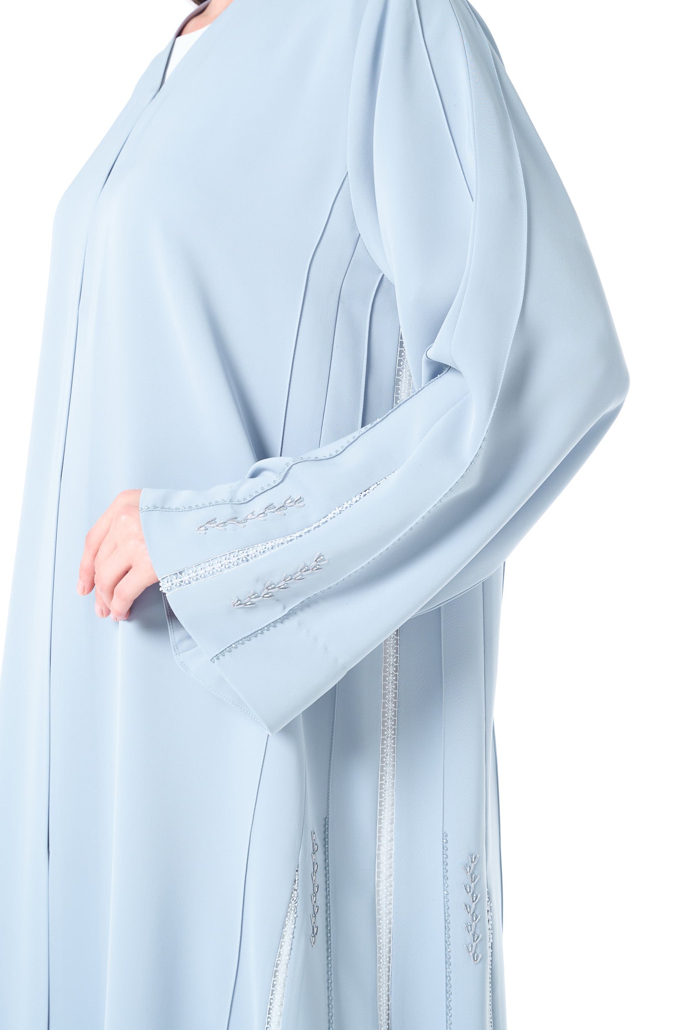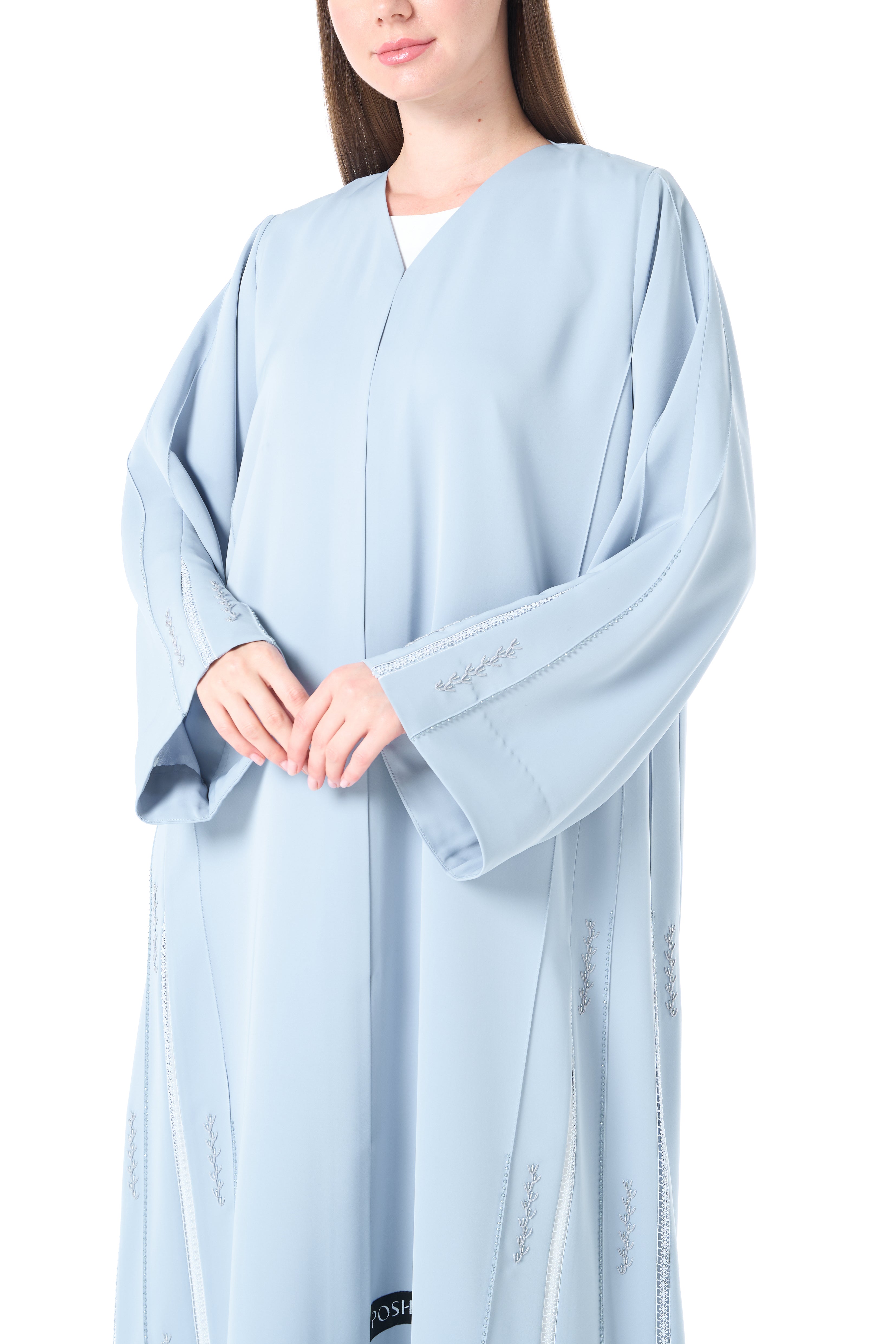 This soft blue abaya is made from lightweight Reem Nada fabric, offering a cool touch and elegant structure. The KLOSH cut allows for modest flow and ease, while the design highlights lace detailing from the shoulders down the front. The sleeves feature tyre-style embroidery, adding texture while maintaining the clean and composed look. A soft V neckline keeps the overall finish refined and modest.