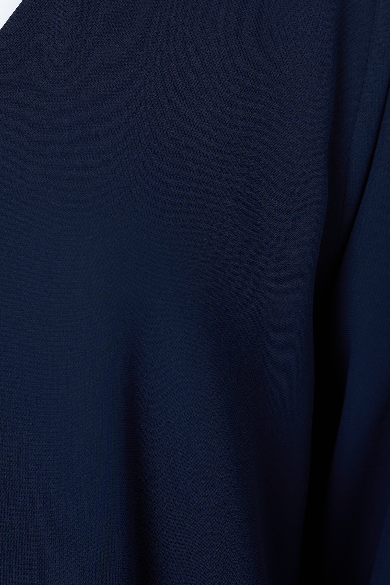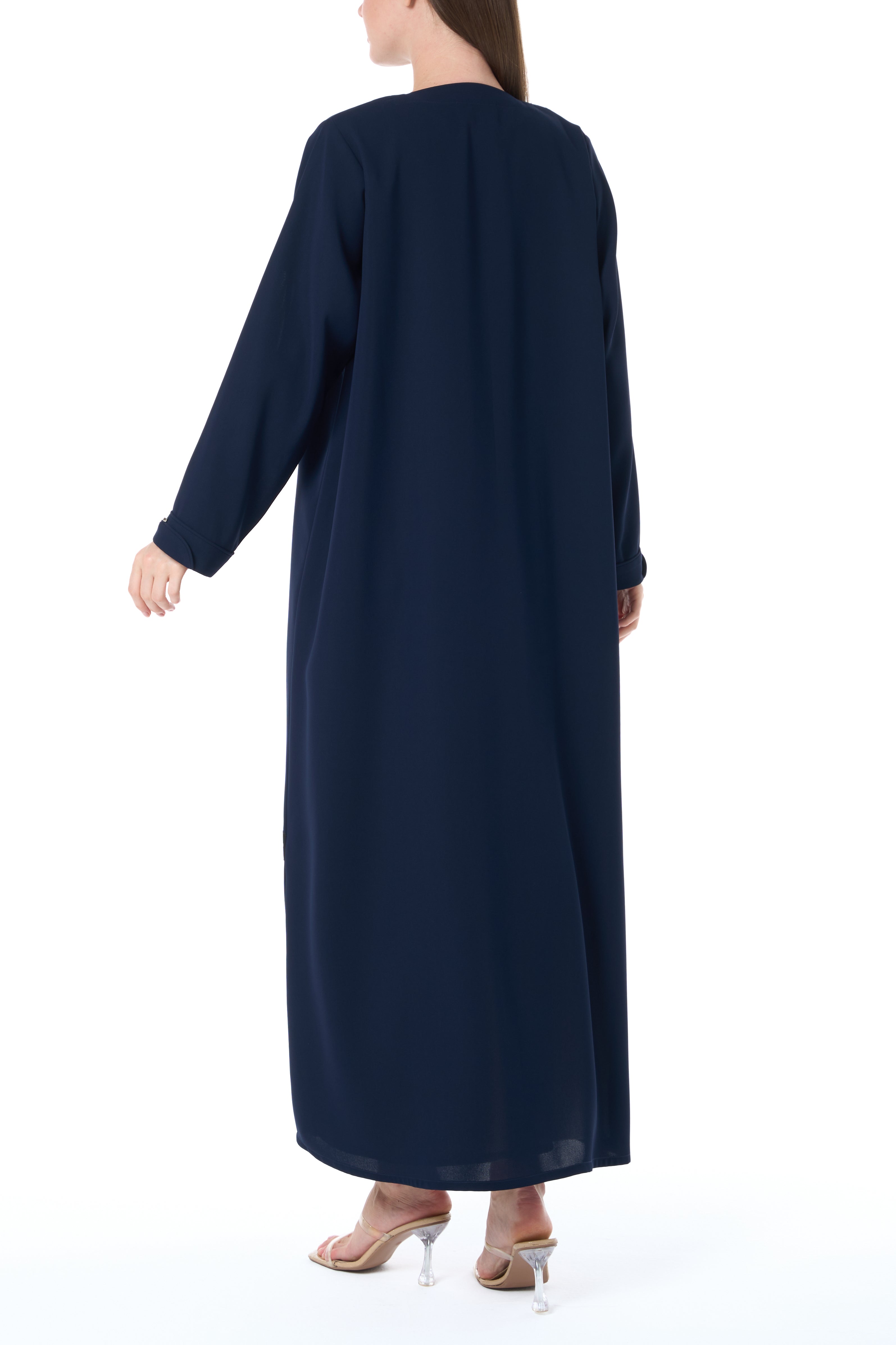 This straight-cut abaya in soft Wave Crepe is a refined essential for polished days. Designed in an elegant blue tone, it features silver square buttons and contrast piping along the front and sleeves, offering subtle distinction while keeping the look modest and elevated. The fabric is breathable yet structured, ideal for long hours at work or social settings.