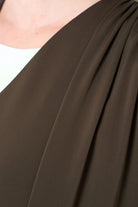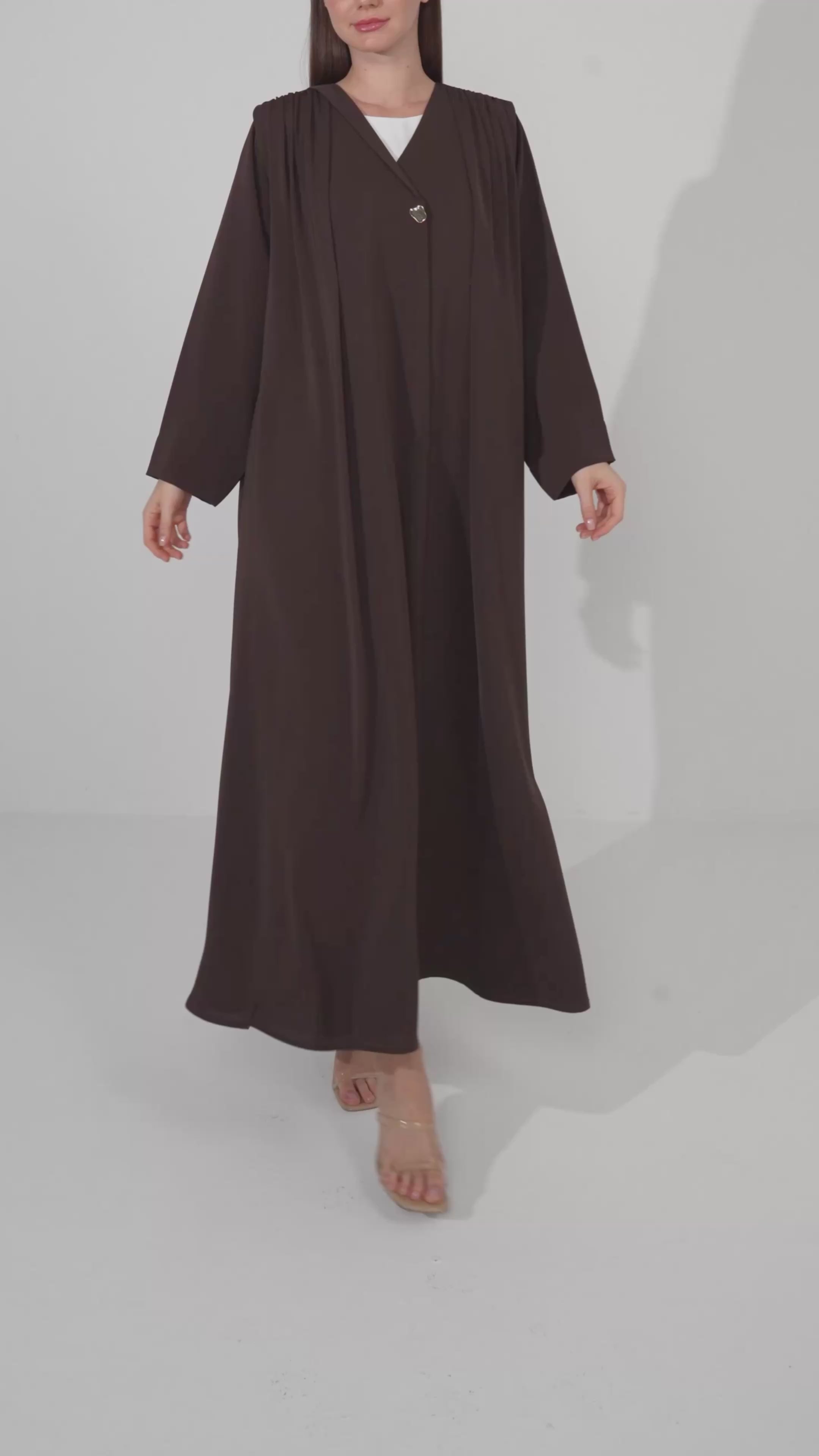 Structured simplicity defines this abaya crafted from Classic Nada Crepe in a warm brown tone. Designed in a KLOSH cut, it features a single-side pleat extending from shoulder to waist, subtly shaping the silhouette while maintaining modest balance.