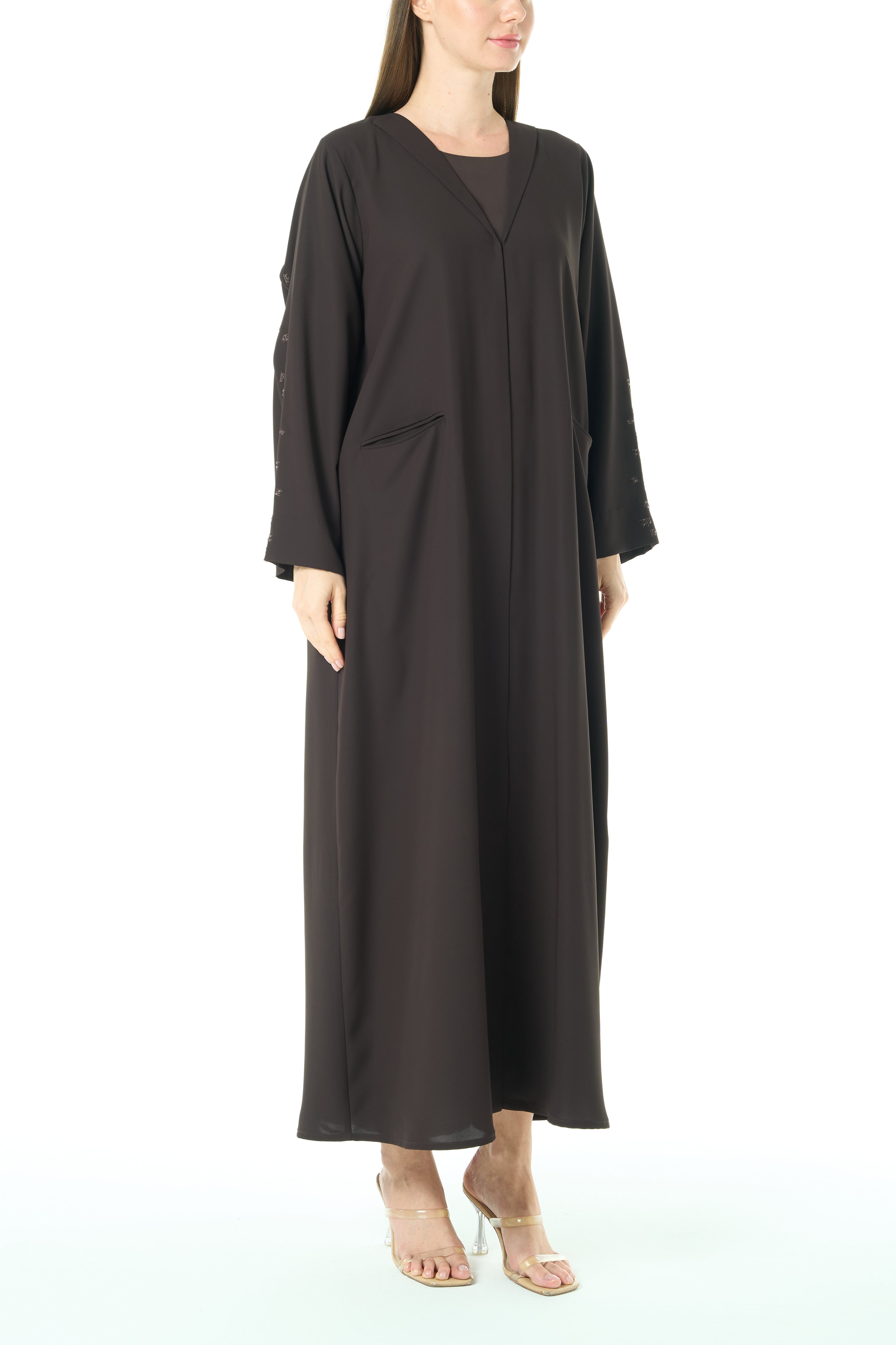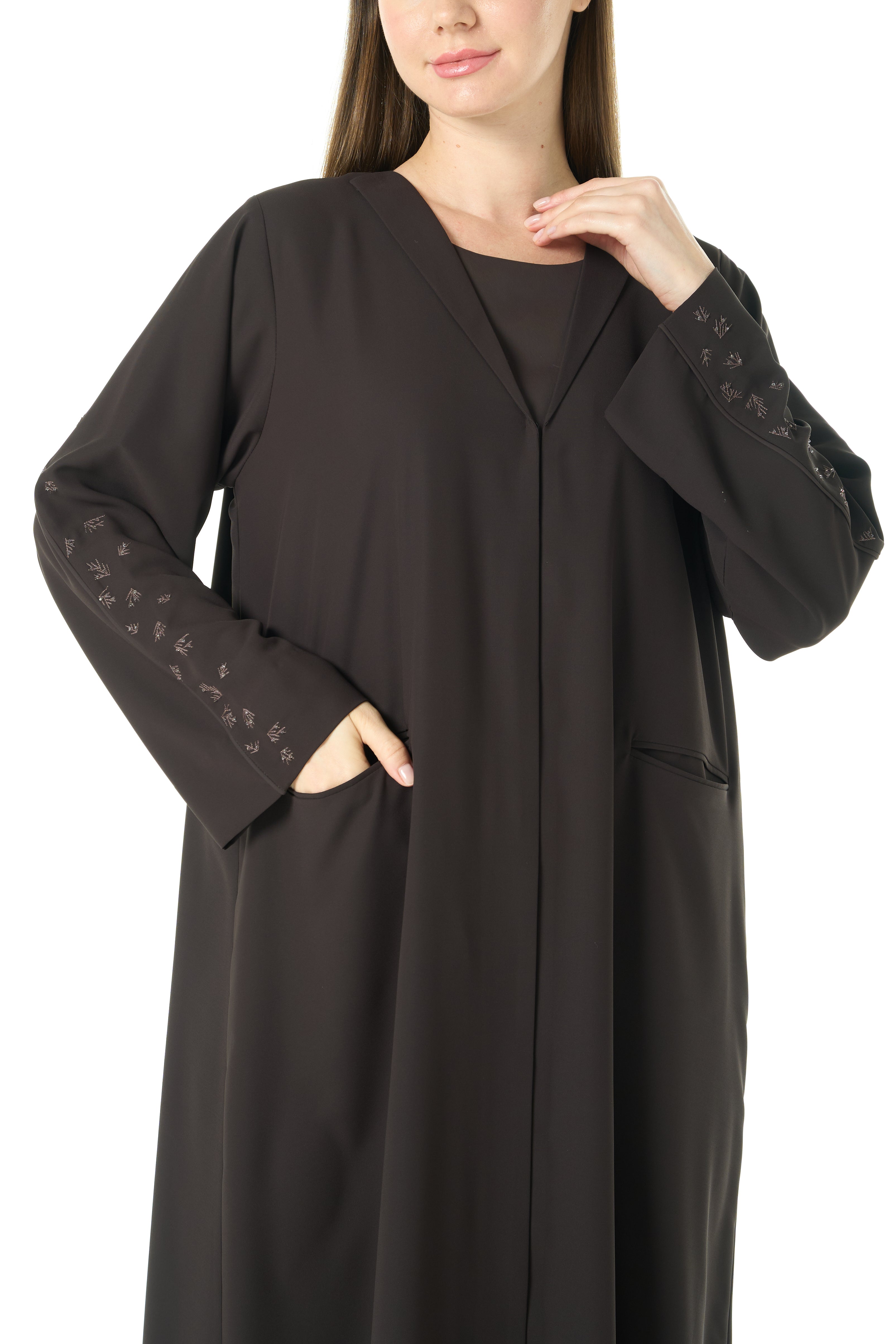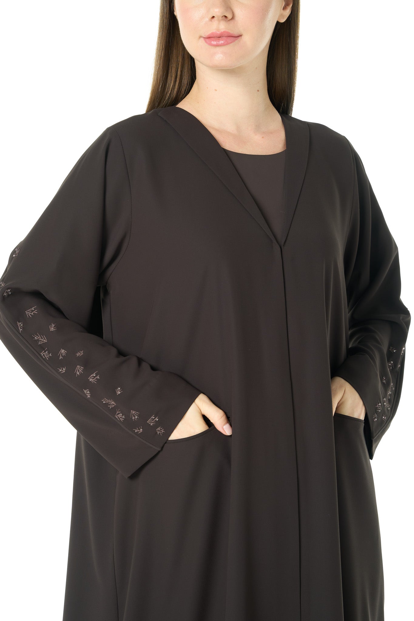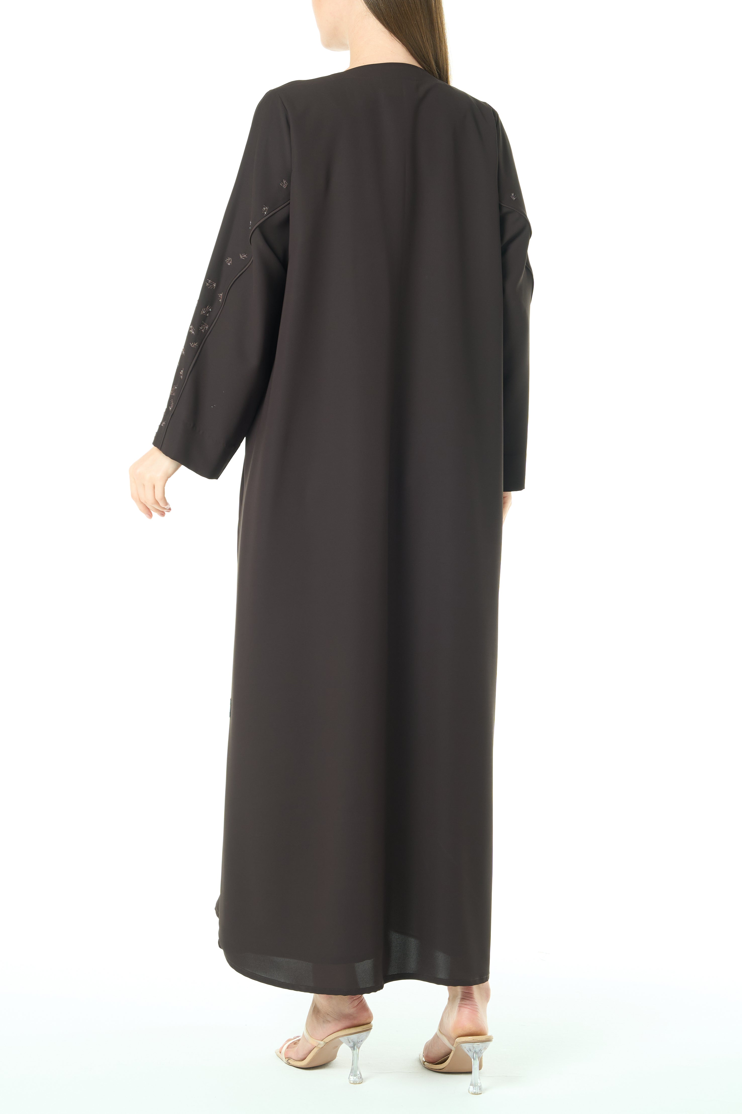 This Brown abaya is crafted from lightweight Cool Crepe and features hand-applied beadwork along the front, combining refined texture with a rich earth-tone palette. The beadwork includes soft brown poth beads and resham thread accents, arranged with care to keep the overall look modest and focused. Designed in a KLOSH cut, the silhouette opens from the waist for natural flow while maintaining coverage and structure.