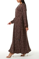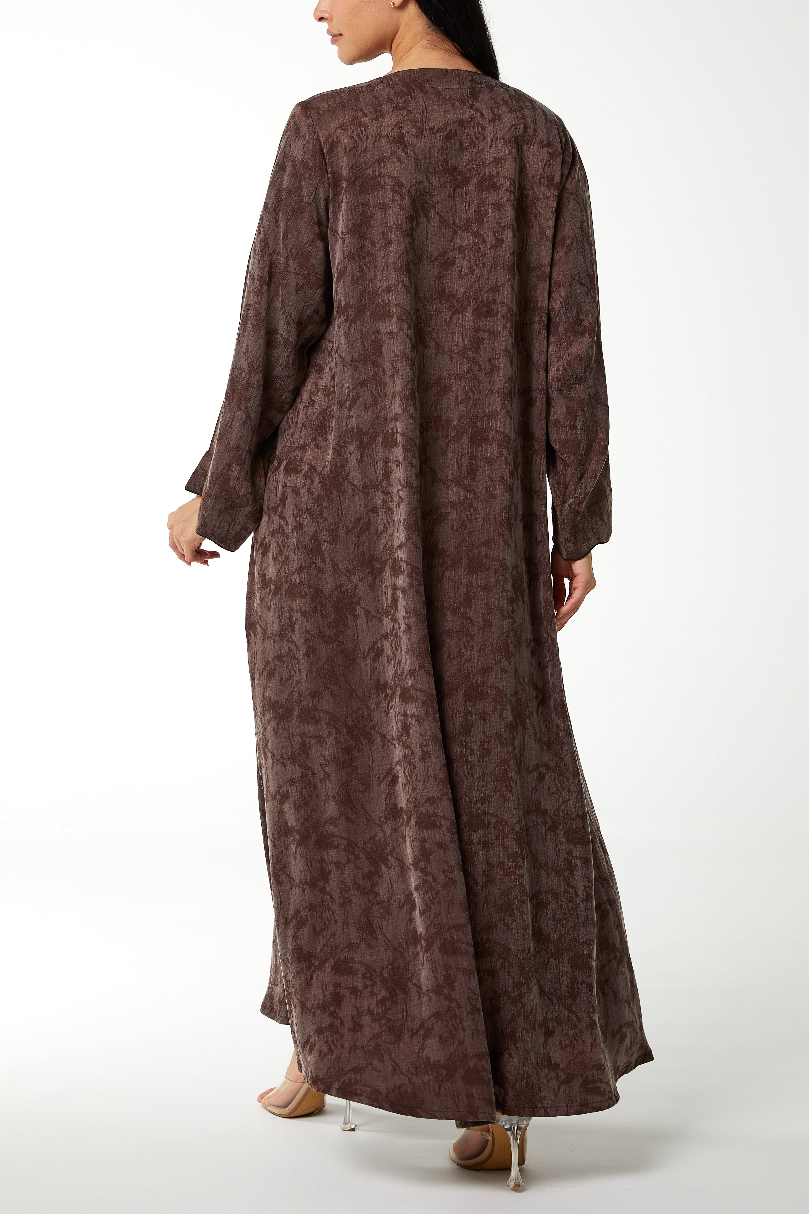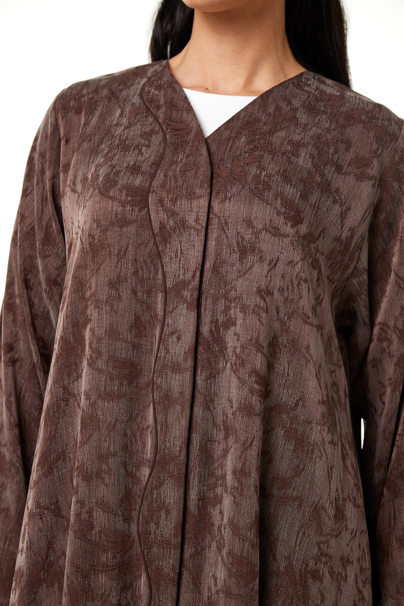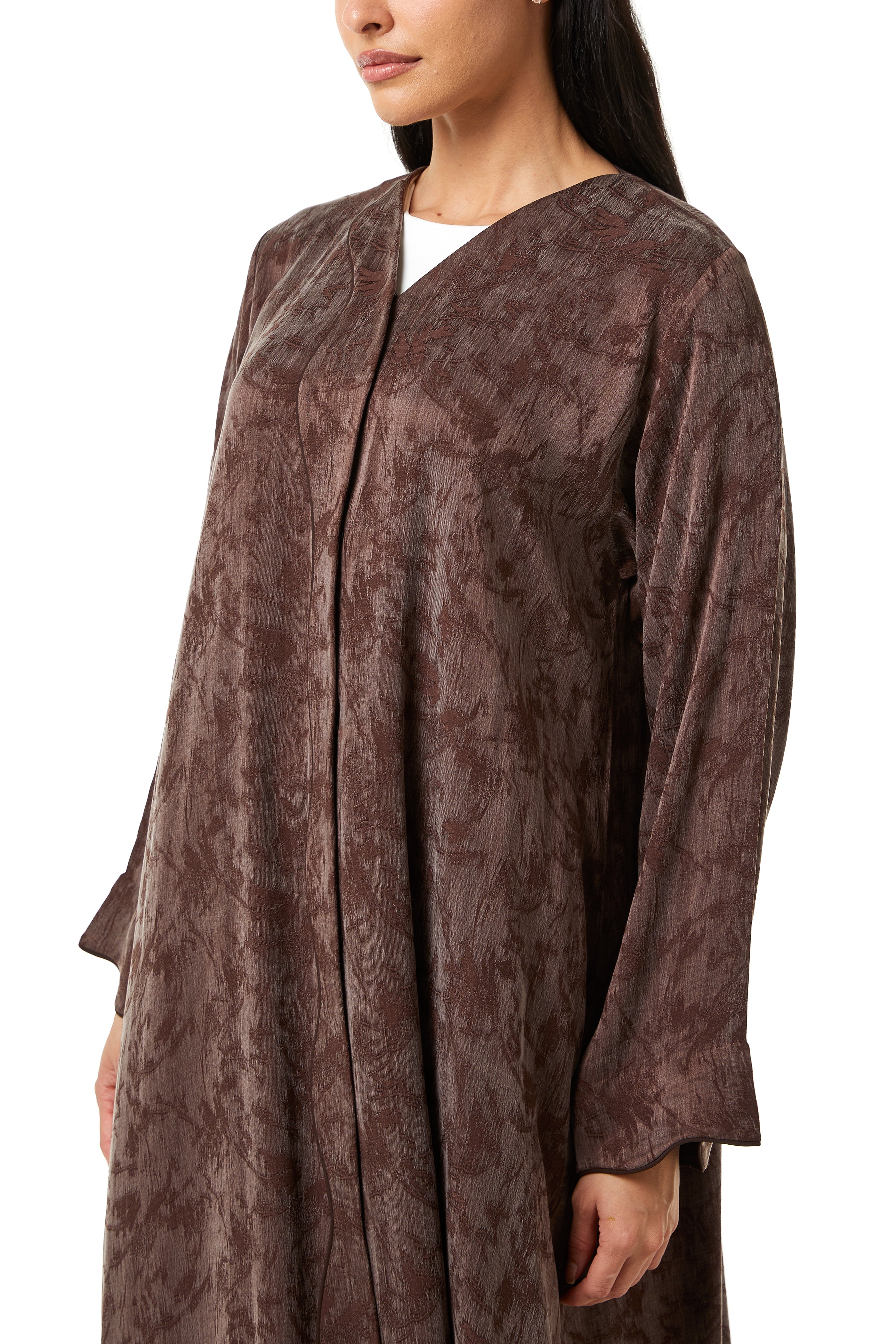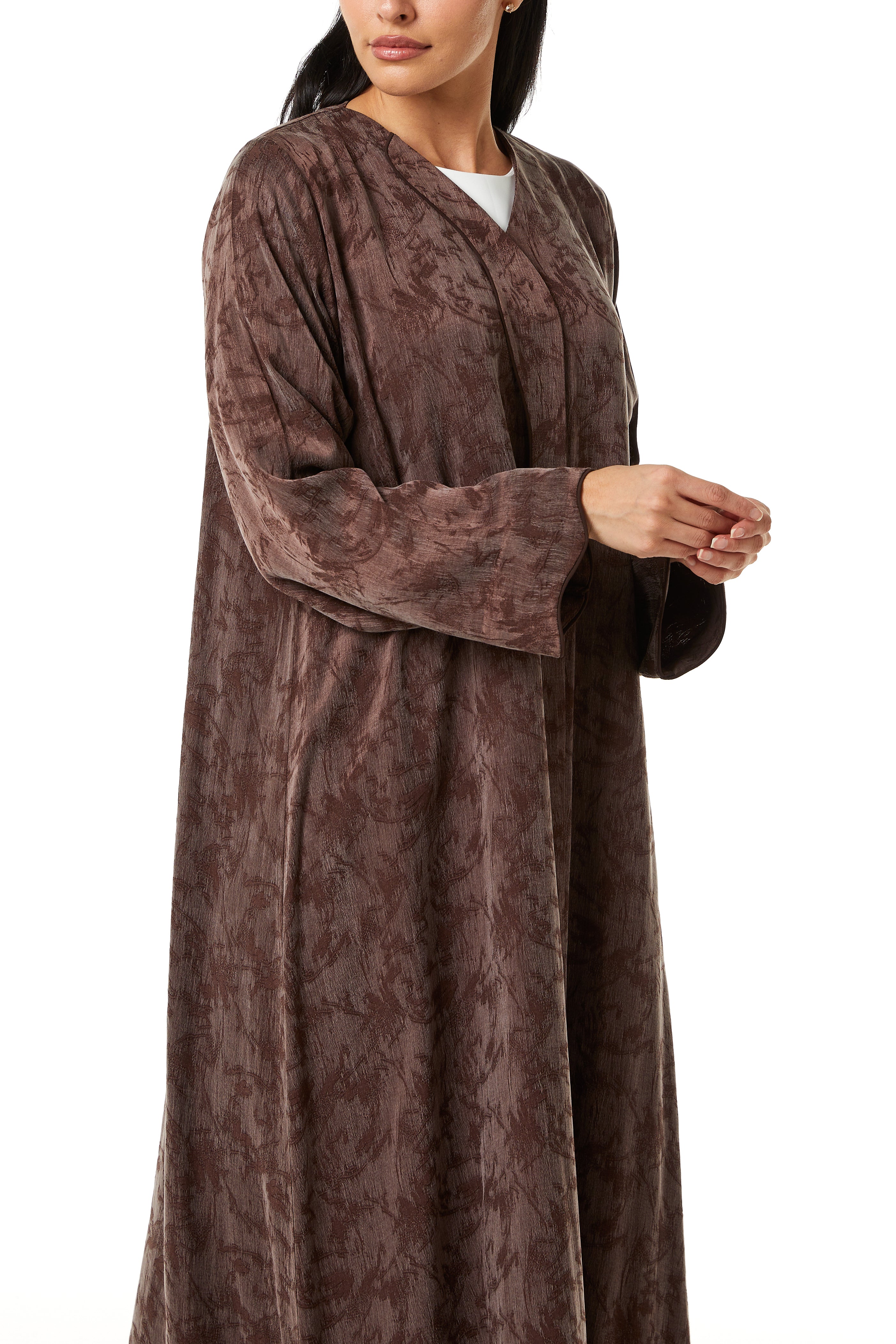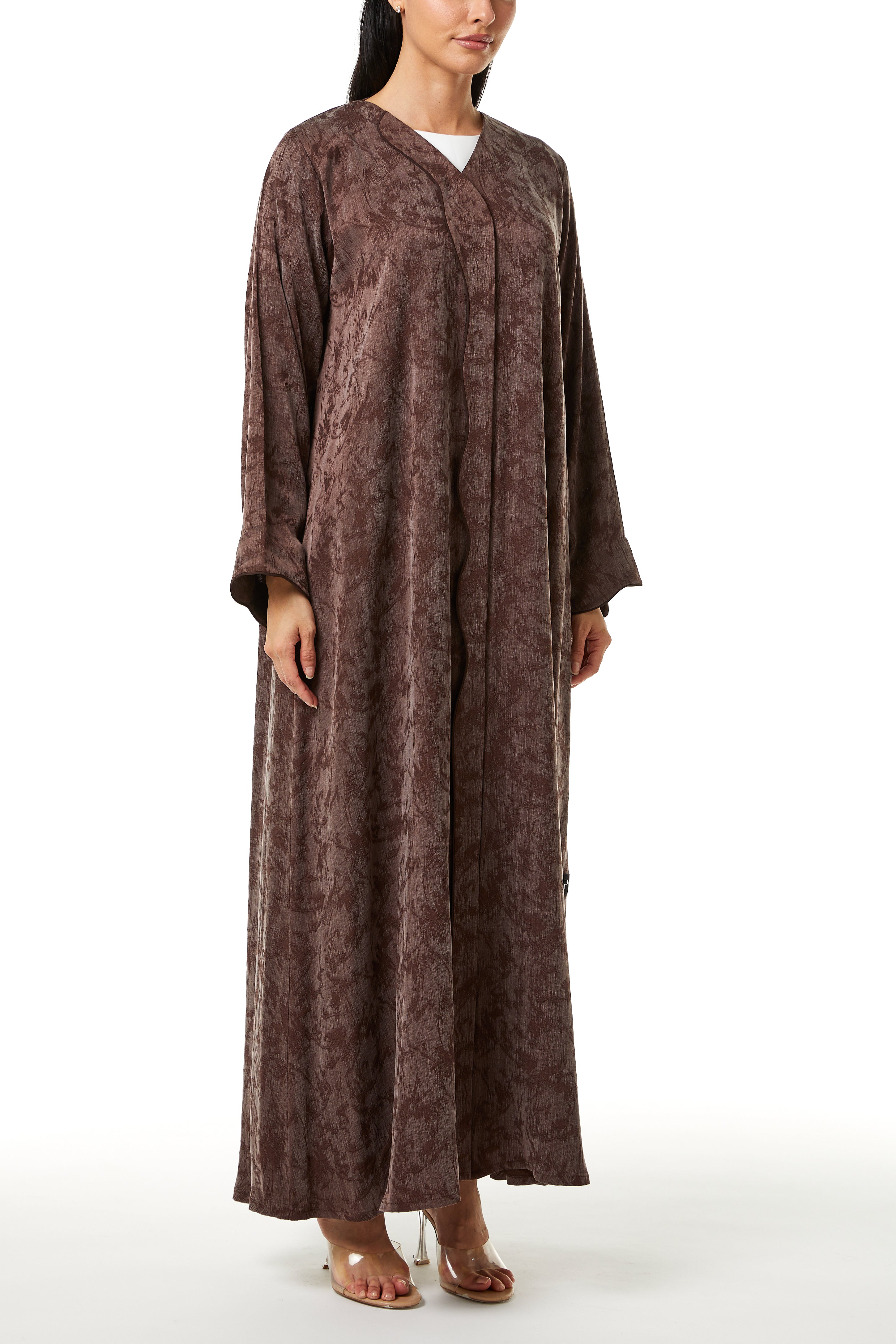 This abaya features a modern front overlap construction with a clean V neckline. The structure remains modest while offering a contemporary finish. The front line flows smoothly downward, creating a streamlined and balanced silhouette.