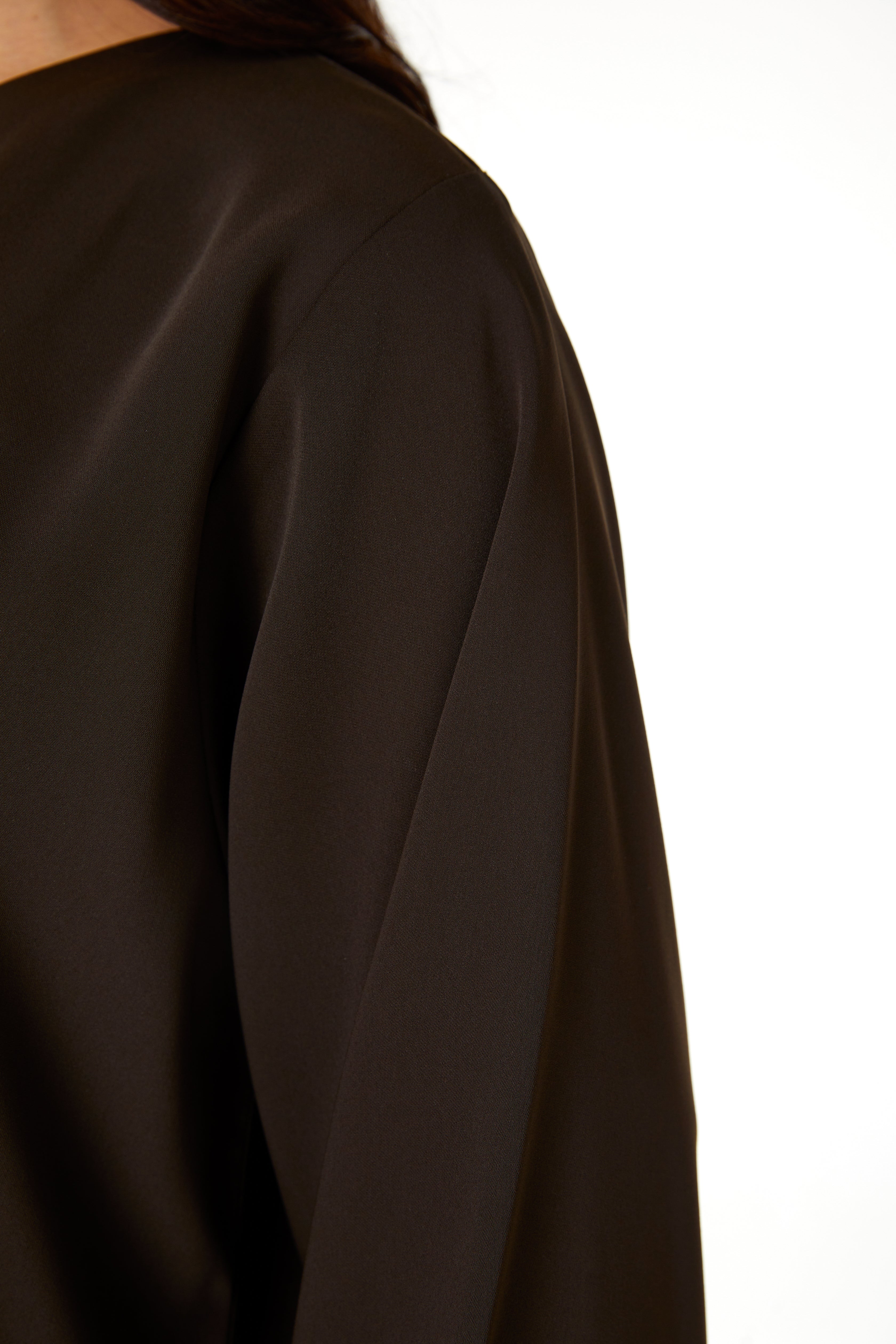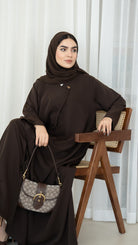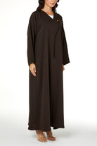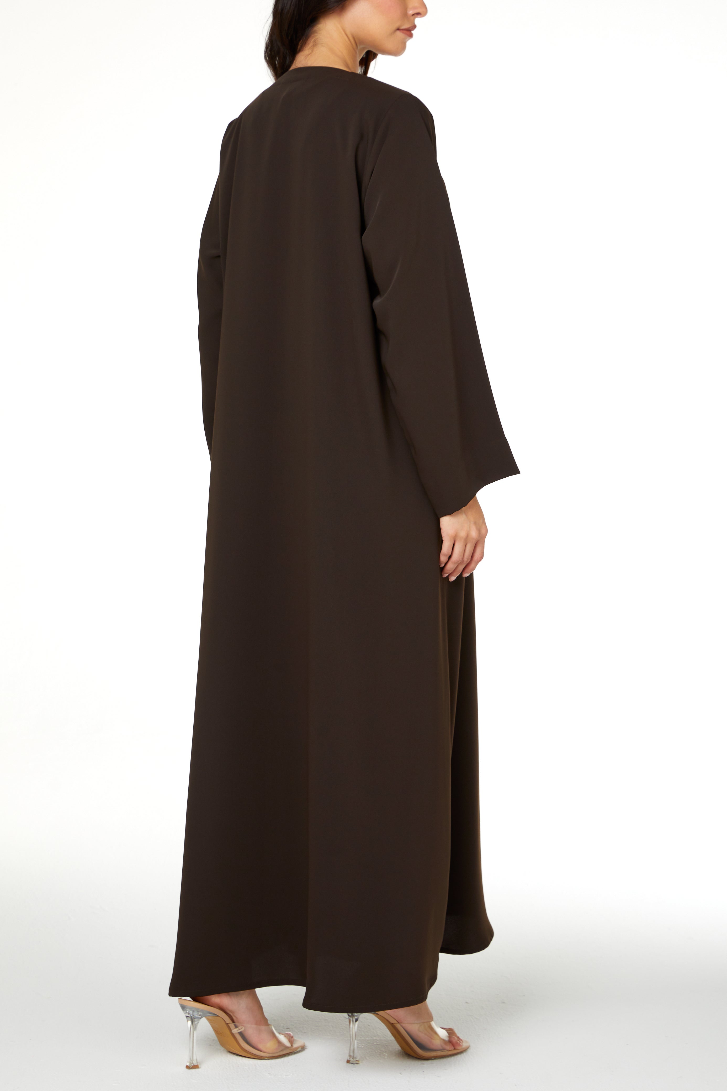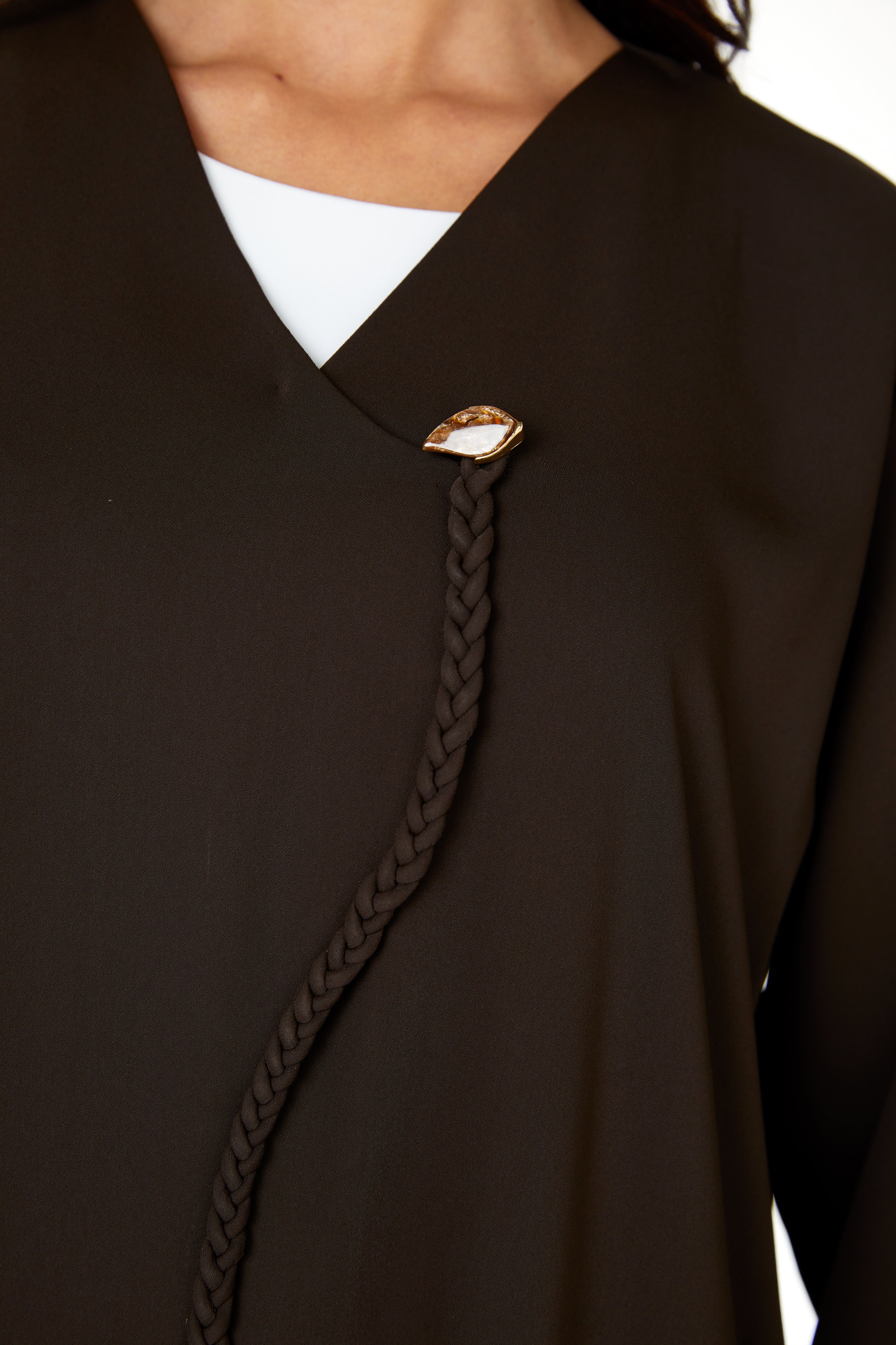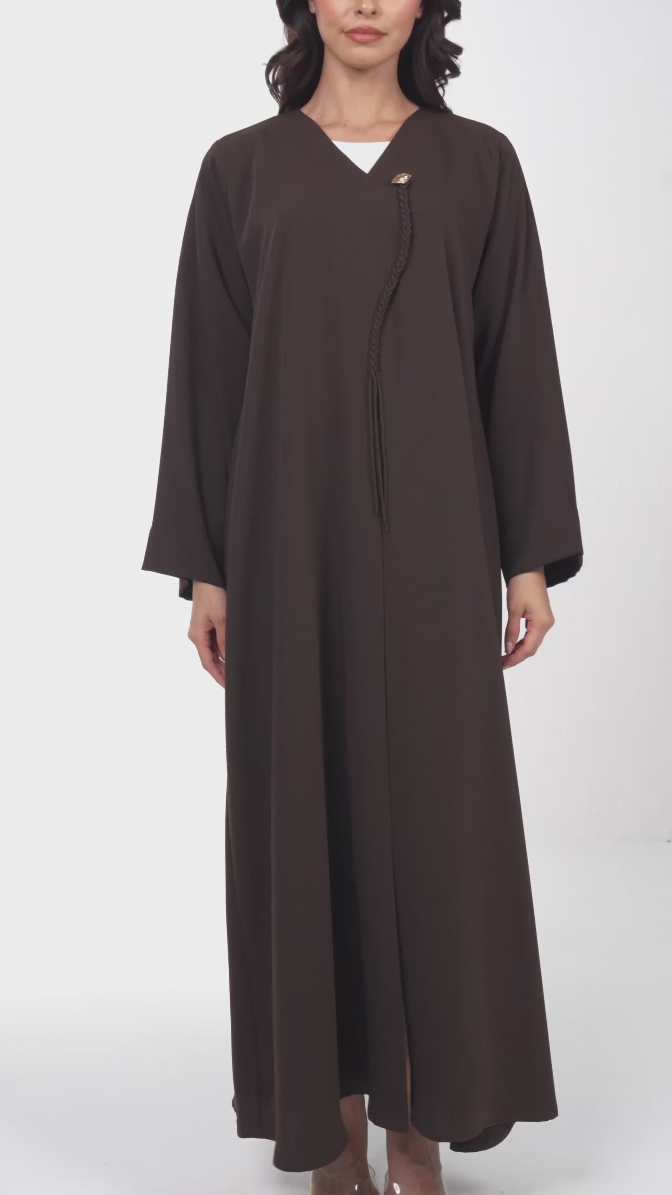 A refined abaya in warm brown Zoe Crepe, tailored in a flowing KLOSH silhouette for natural movement and graceful structure. The neckline forms a soft V-cut, leading to a hand-braided dori that descends along the front — secured with a single gold-toned show button for an elegant highlight.