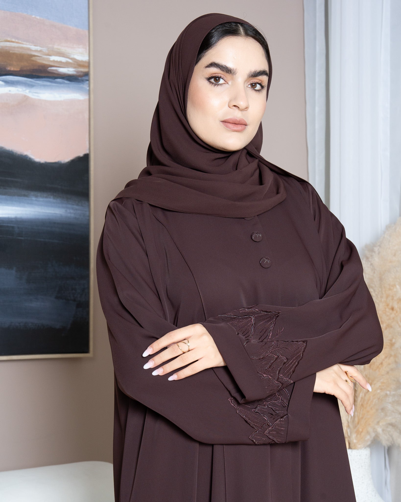 The sleeves feature delicate tonal embroidery in a subtle mountain-inspired pattern. The stitching blends naturally into the fabric and adds gentle texture that feels elegant without being overpowering. With its warm color and lightweight feel, this abaya brings together comfort and sophistication in a very effortless way.
