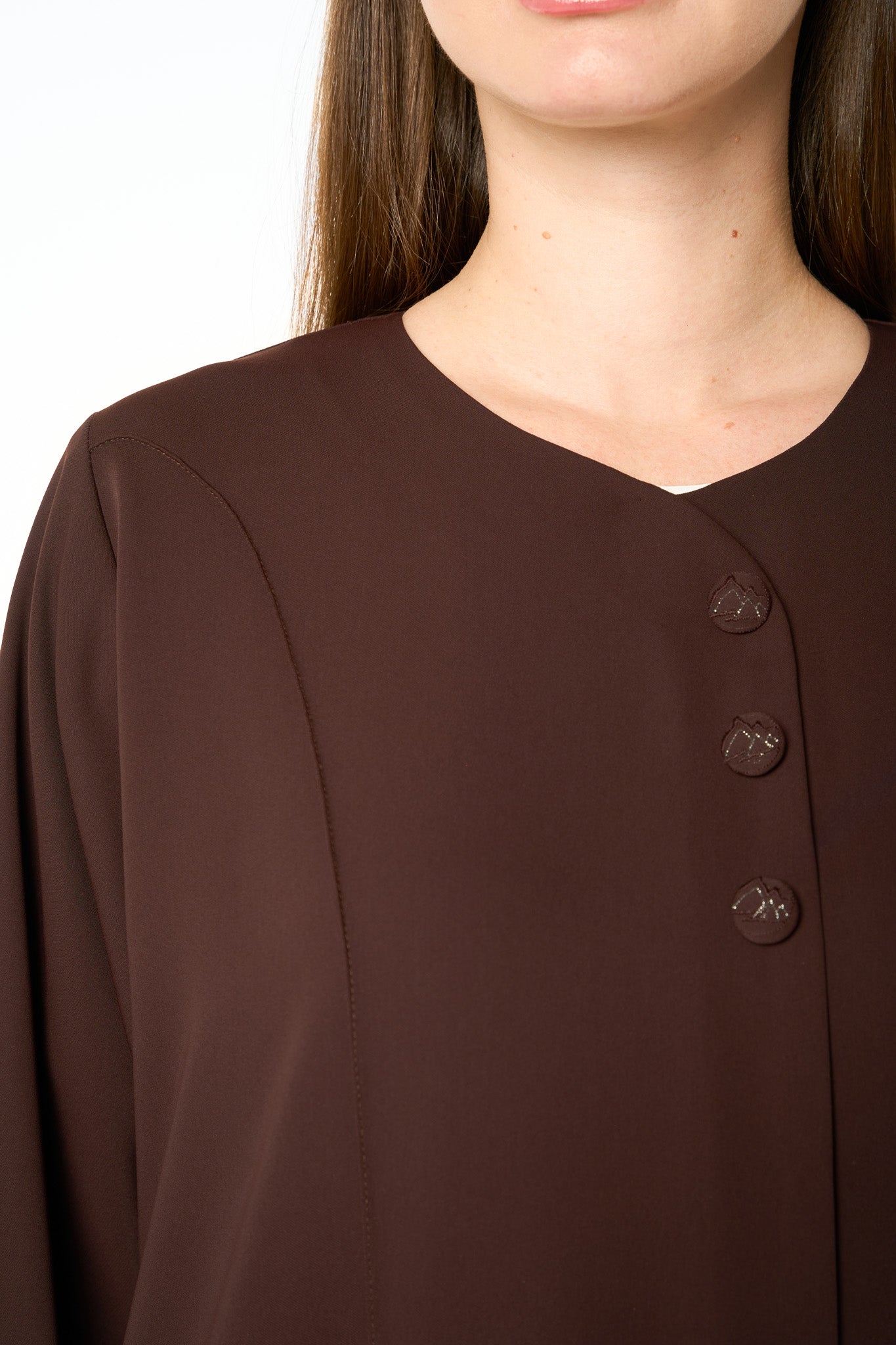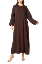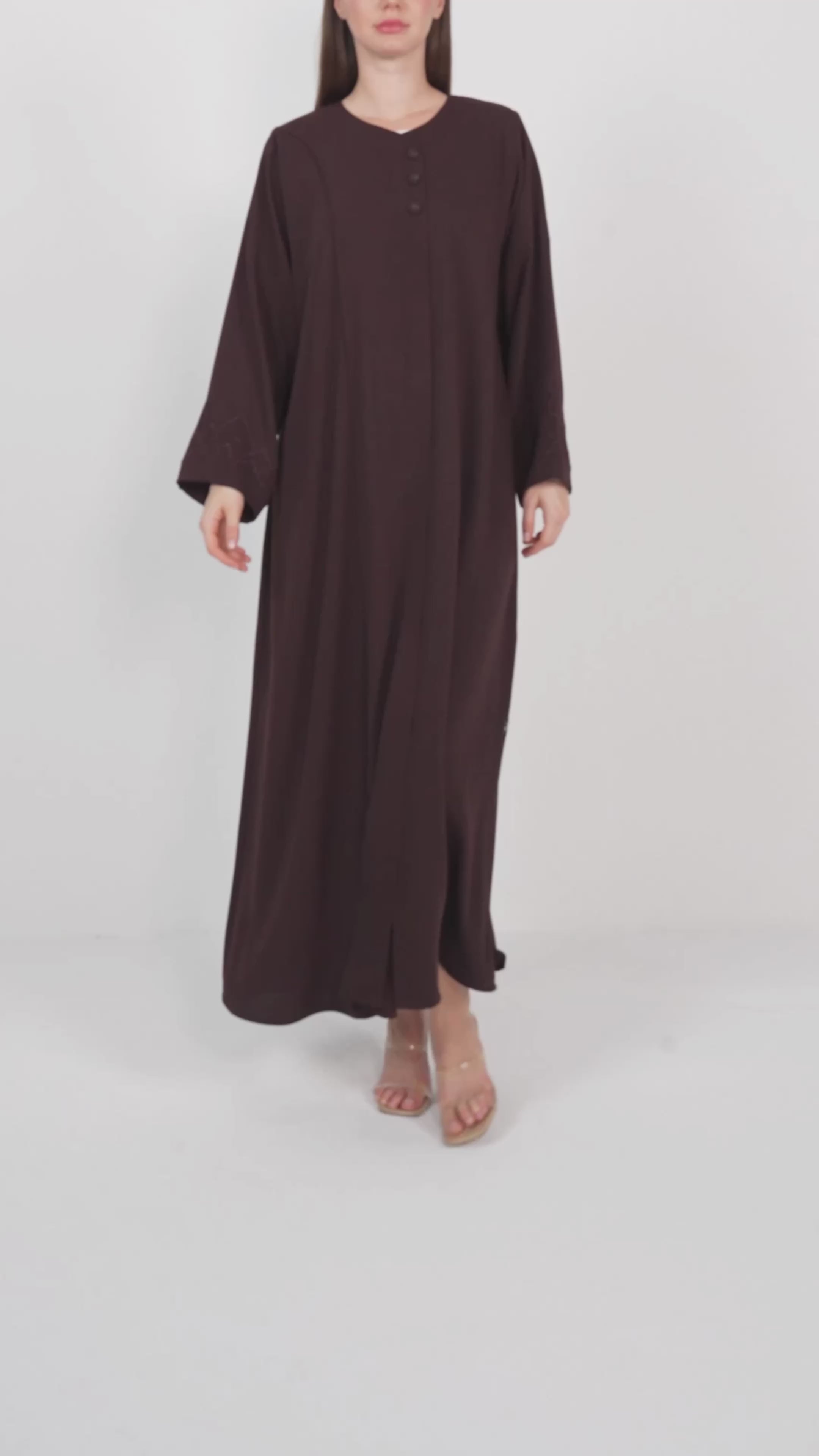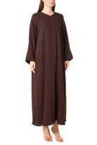This brown abaya is crafted from soft Zoe Crepe and designed in a graceful KLOSH silhouette that drapes beautifully with every step. The round neckline and clean buttoned front create a minimal and refined appearance that suits both everyday wear and professional settings.
