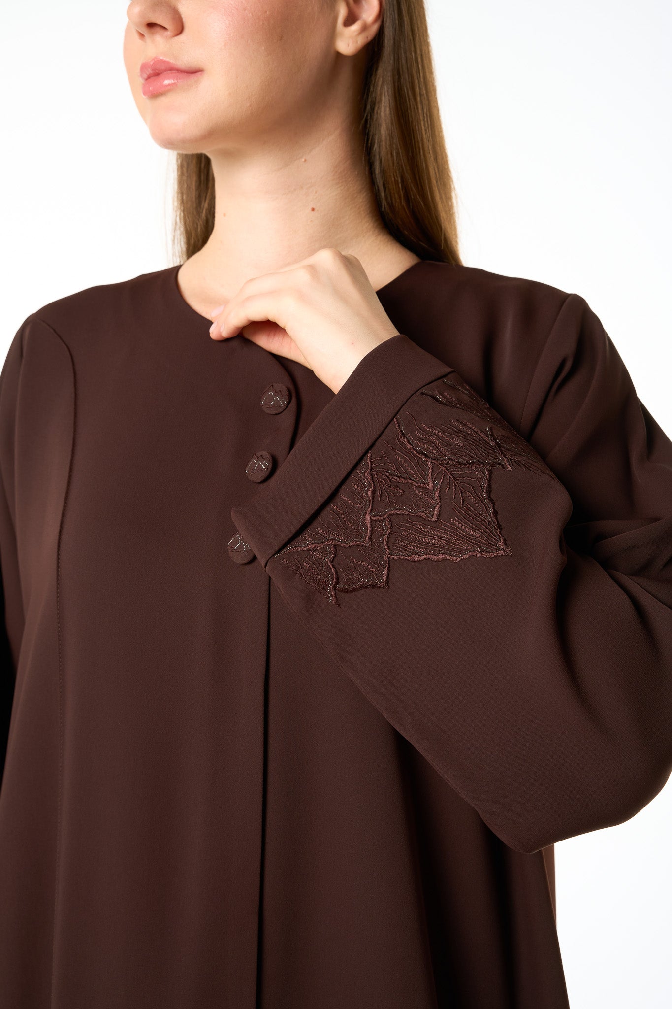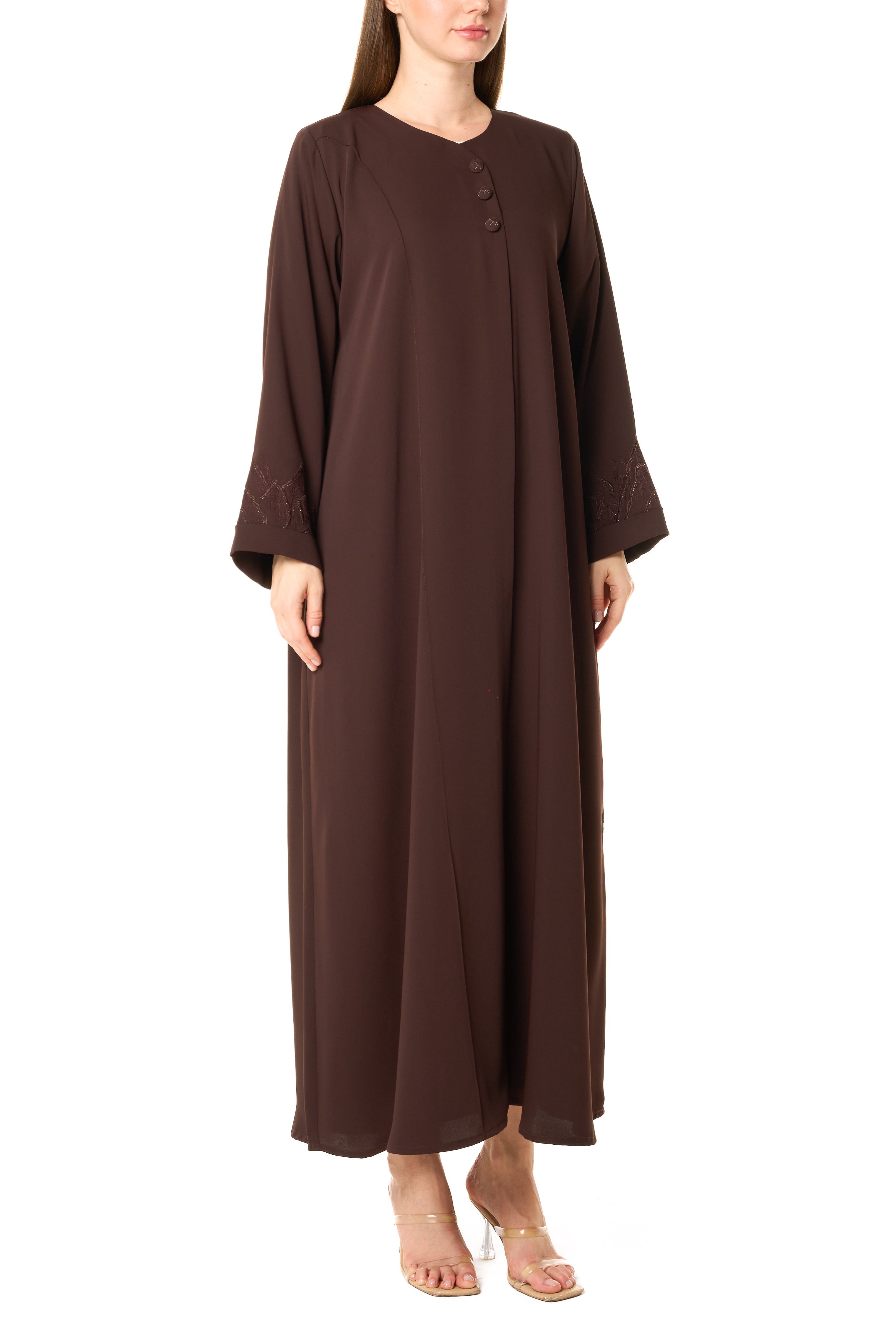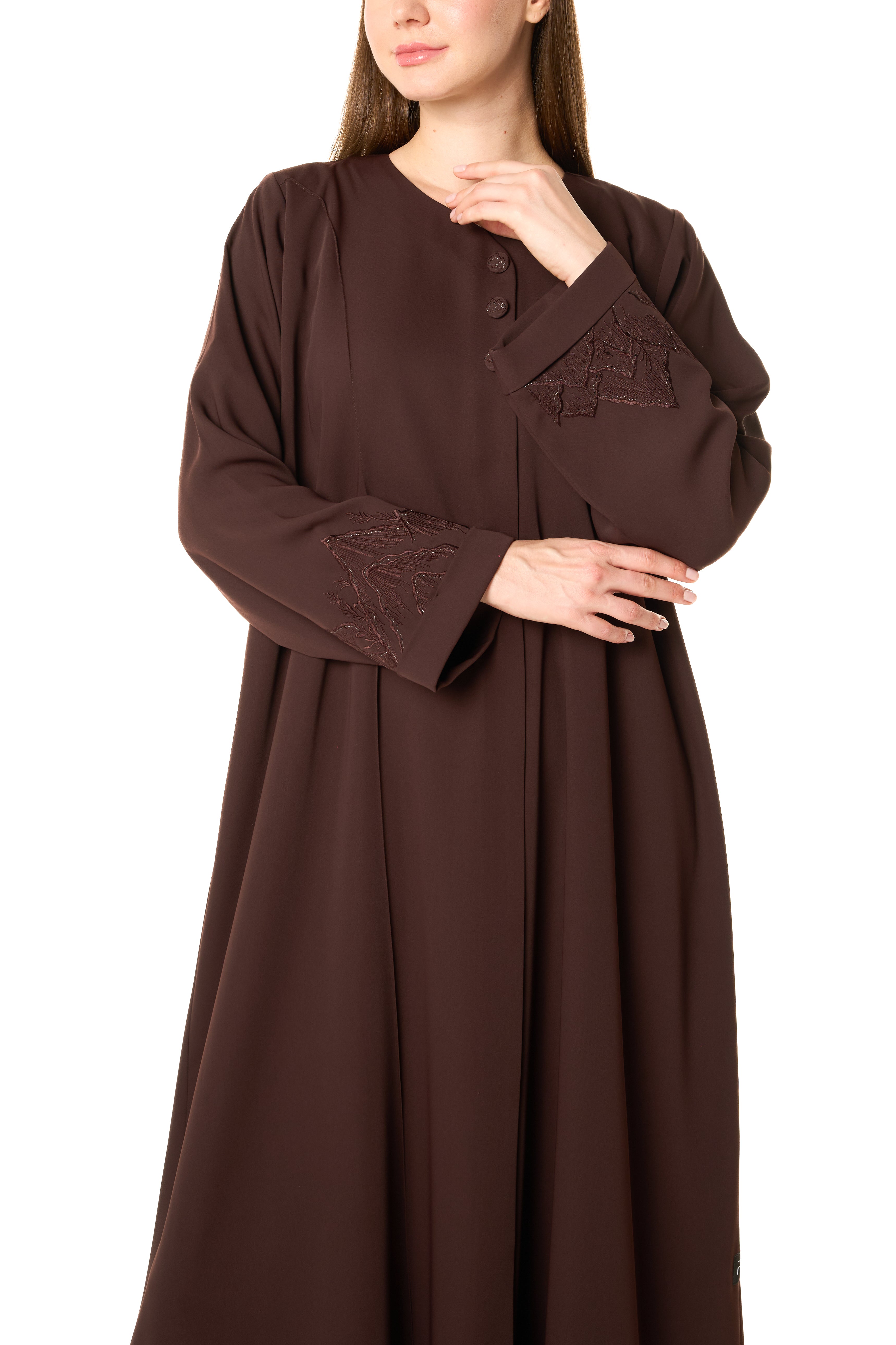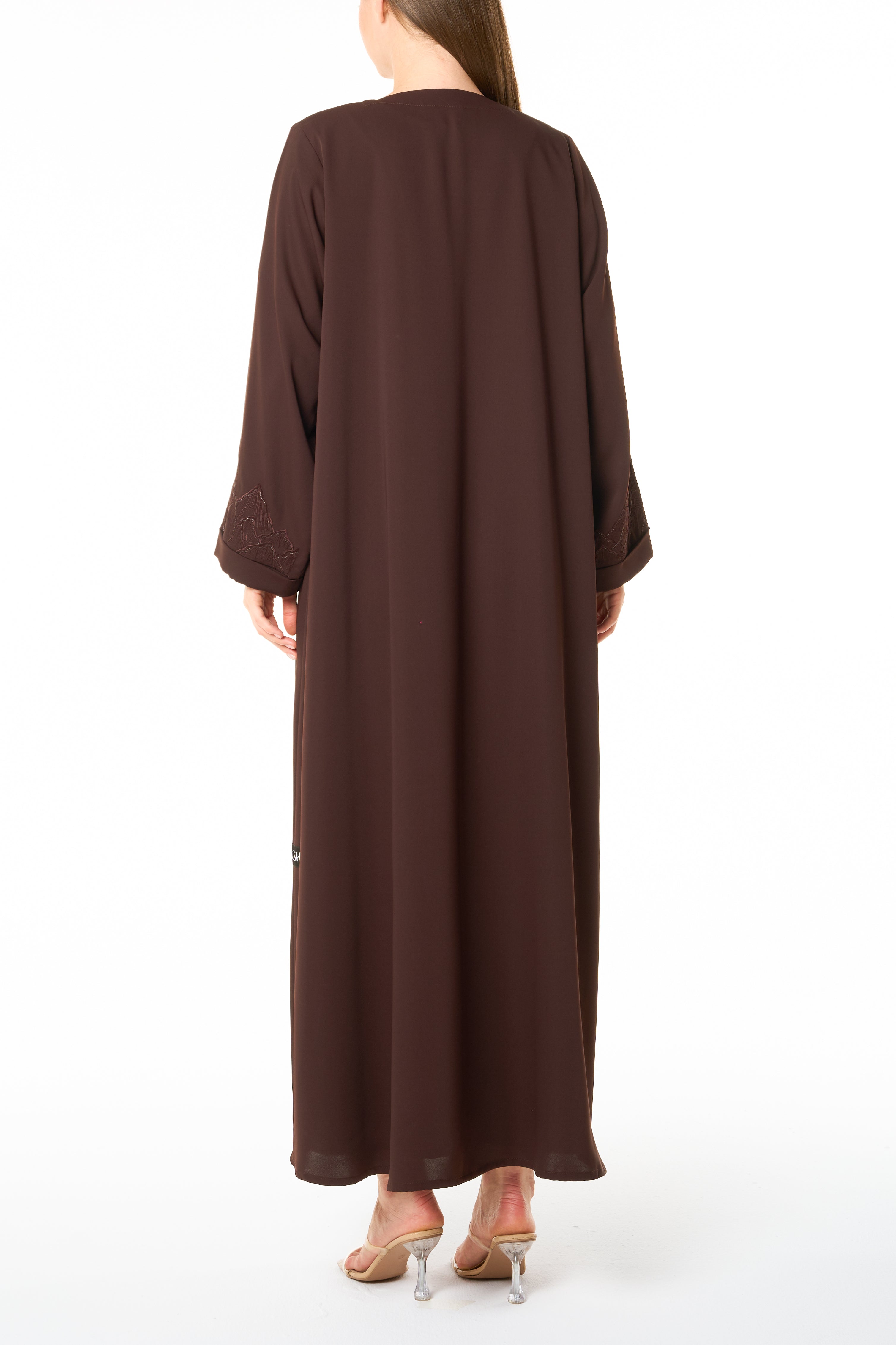 Brown Zoe Crepe Abaya with Tonal Embroidered Sleeve Detail