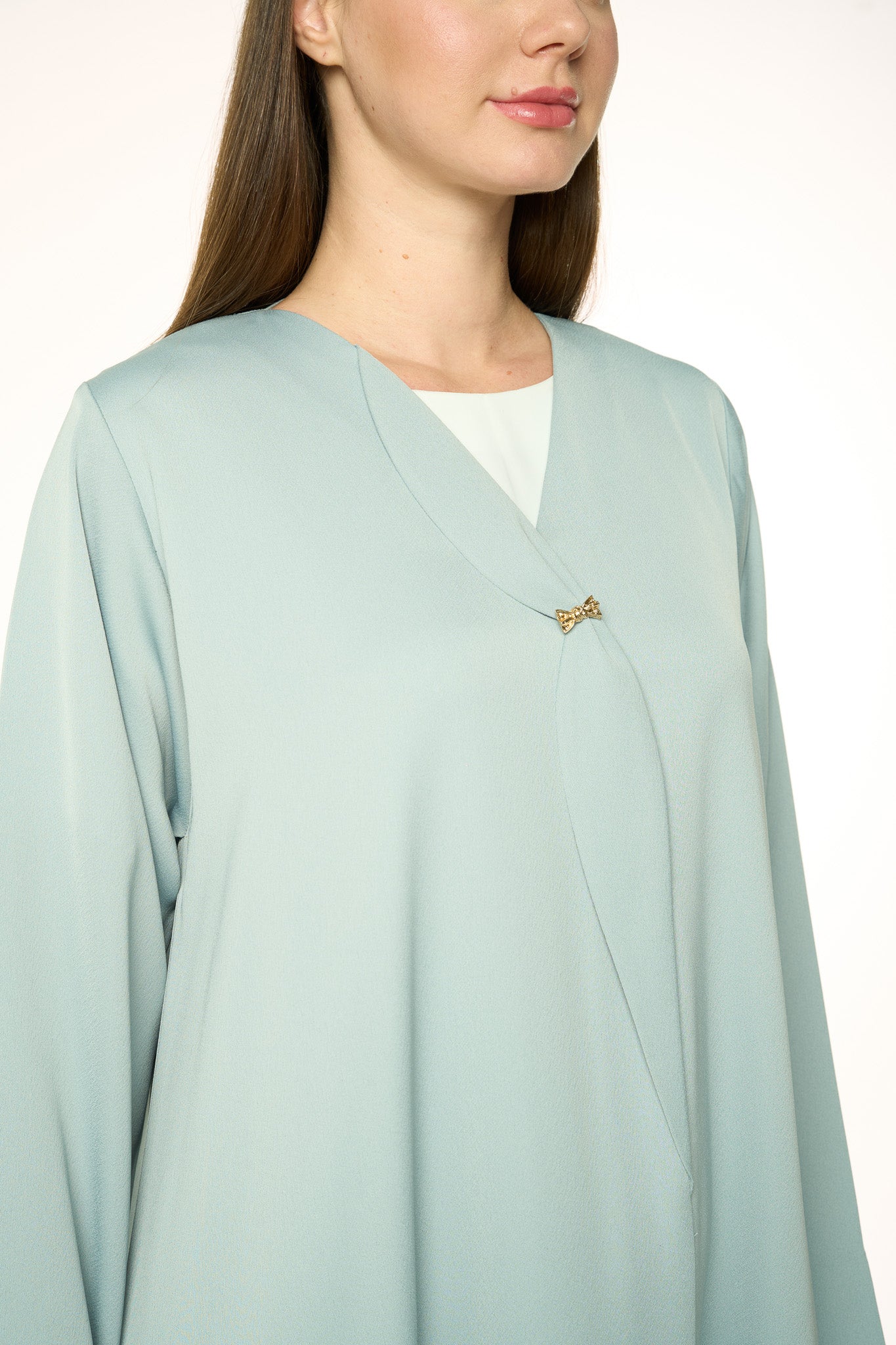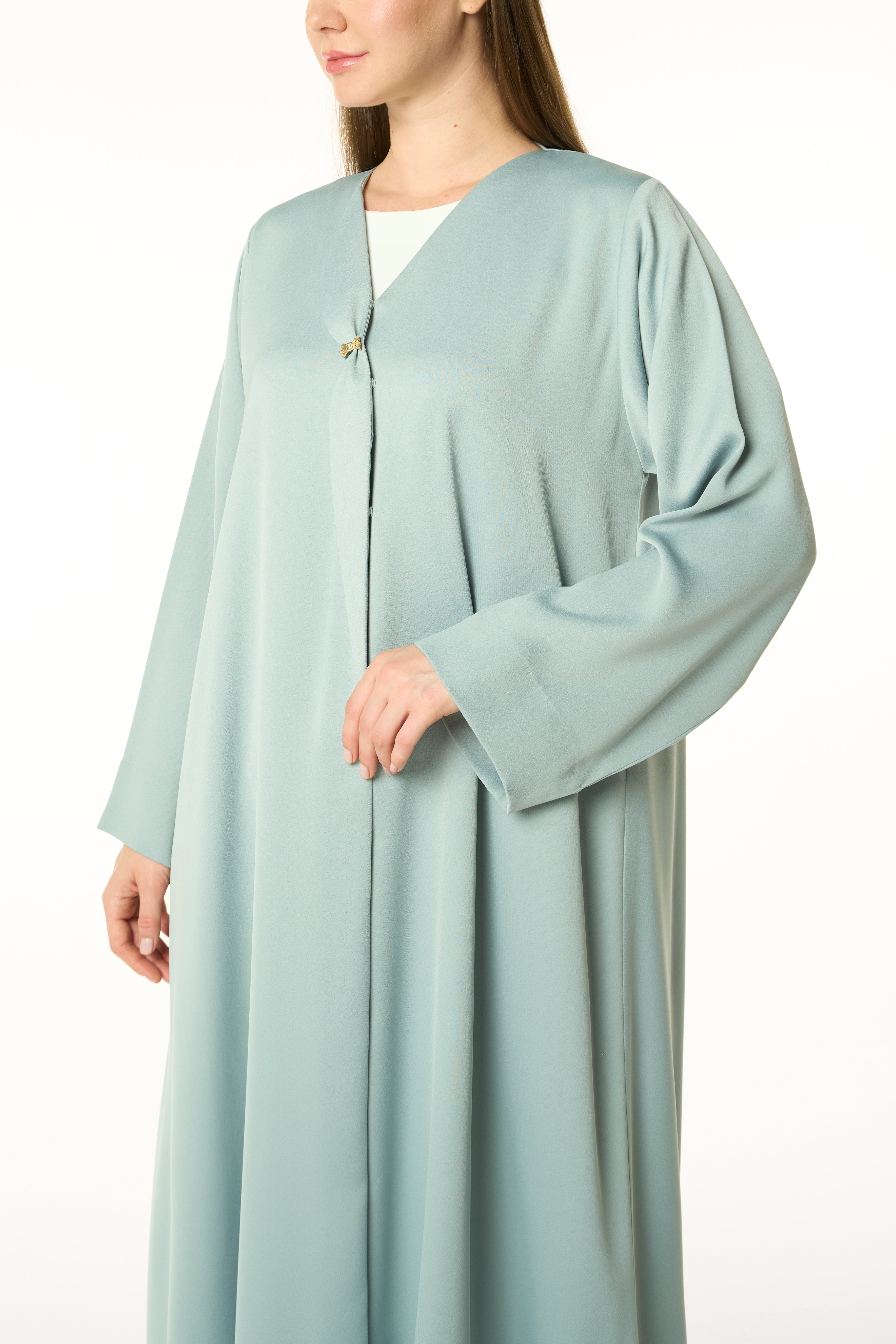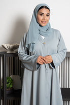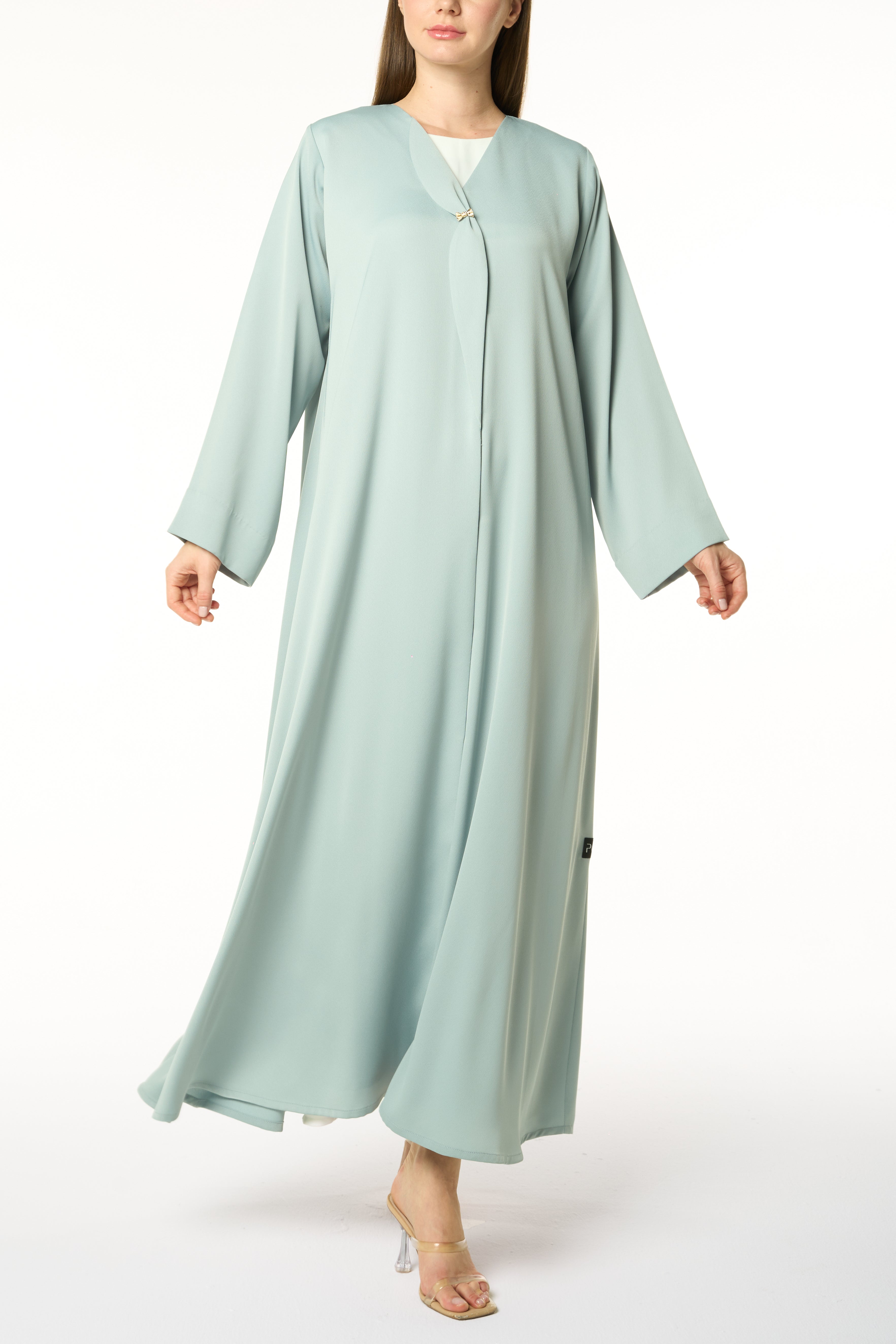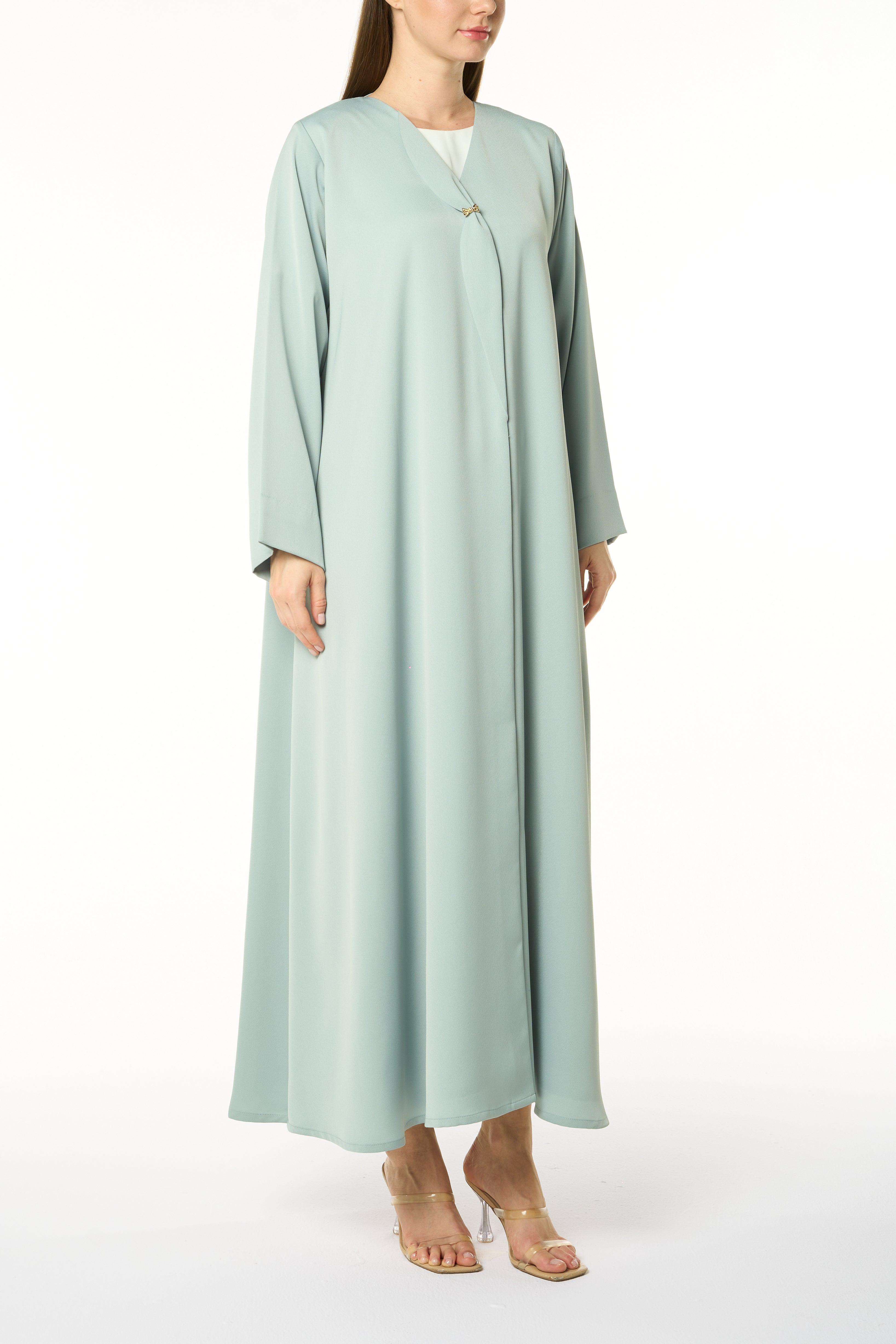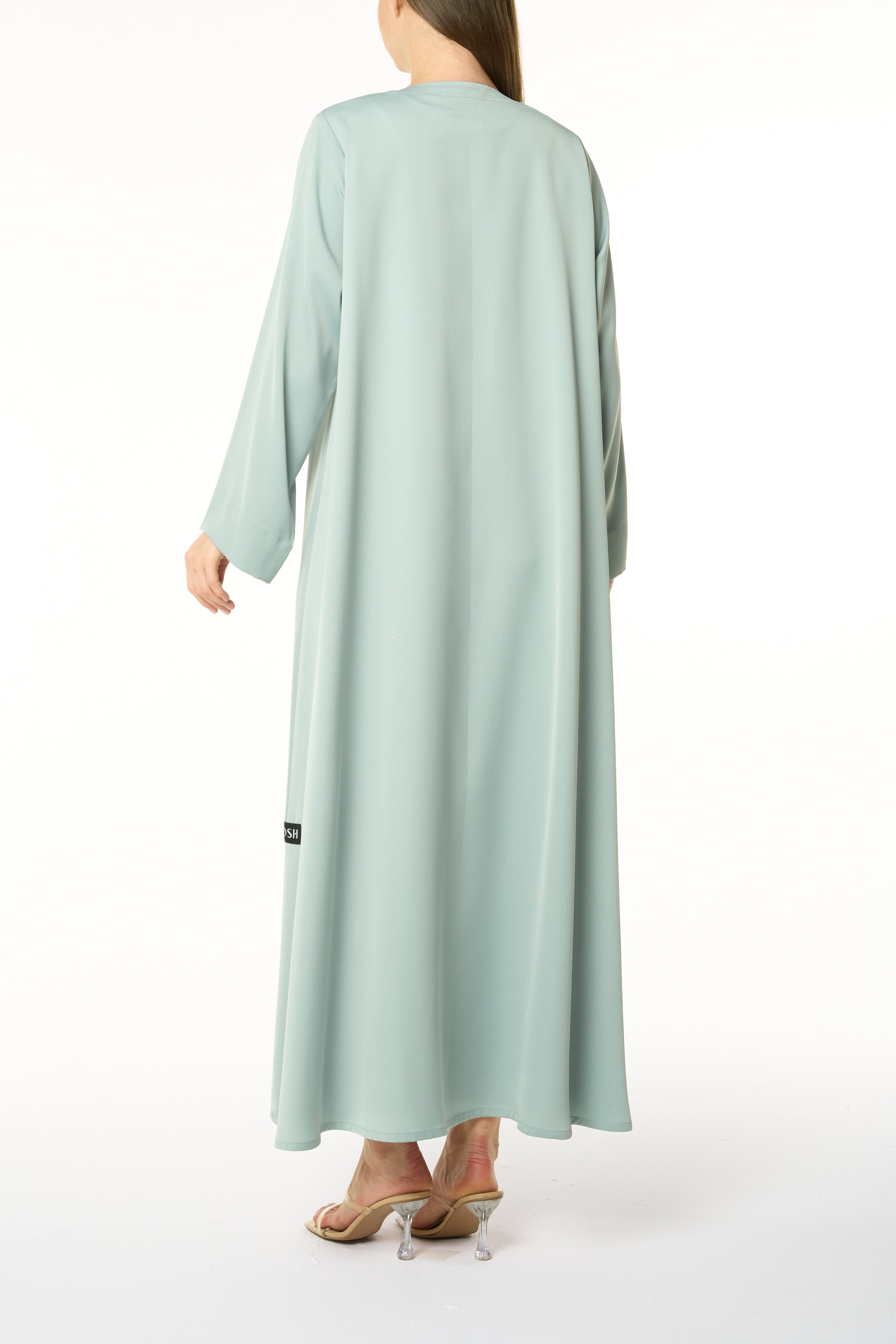 A fresh take on a classic, this abaya is rendered in a muted green Dania Crepe and shaped in a KLOSH silhouette for ease of movement. The neckline is clean and minimal, opening into an overlapping front panel secured with a golden accent button — a subtle design detail that distinguishes the look while keeping it versatile for everyday and travel wear.