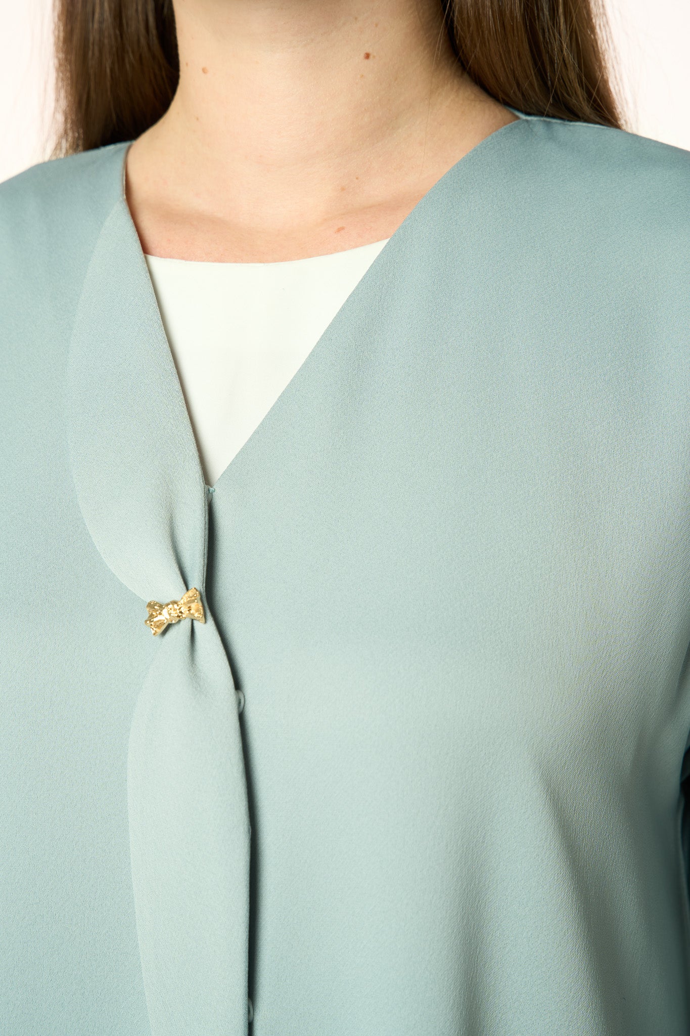 The cut flows smoothly from the shoulder into a gentle flare, offering coverage without heaviness. Snap buttons along the hidden closure and neat topstitching reinforce the garment’s simple, refined finish. The combination of light crepe texture and muted green tone makes it ideal for spring-to-summer wear, while also functioning as an all-year wardrobe essential.
