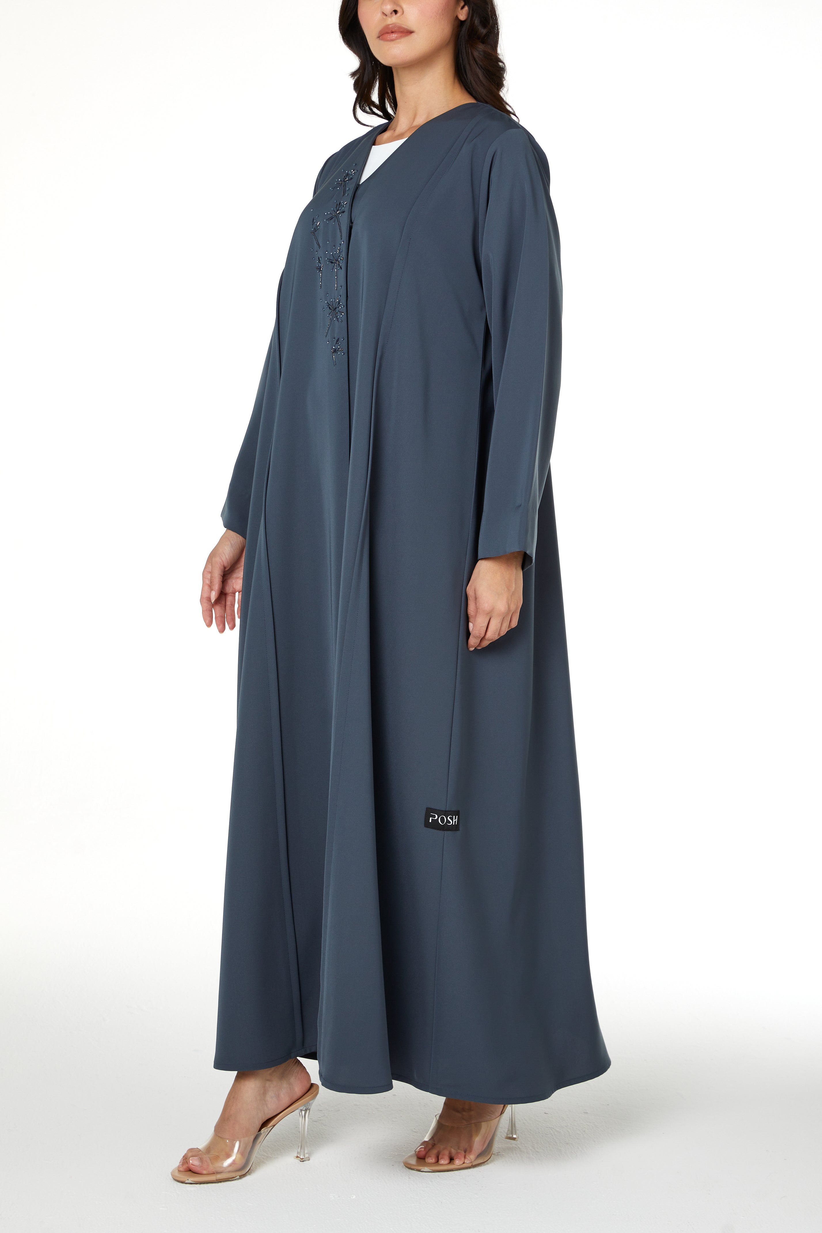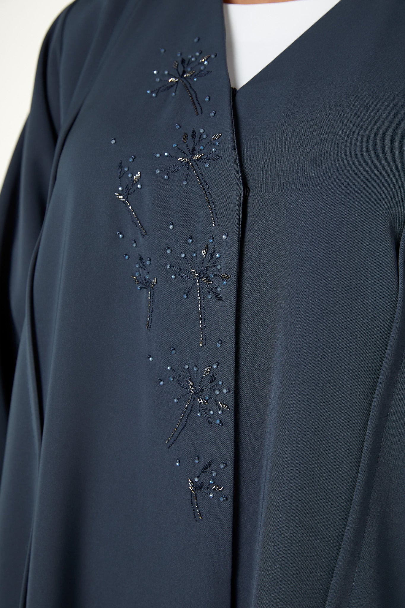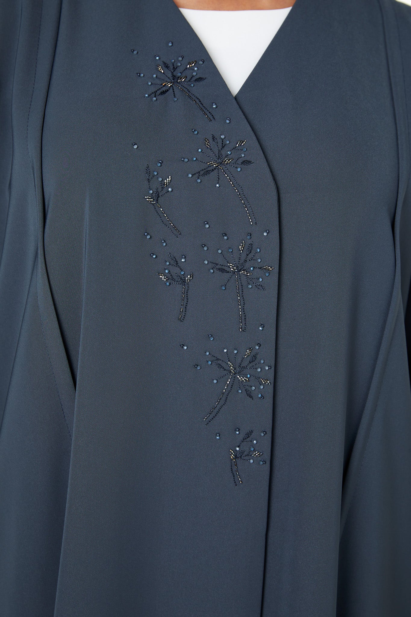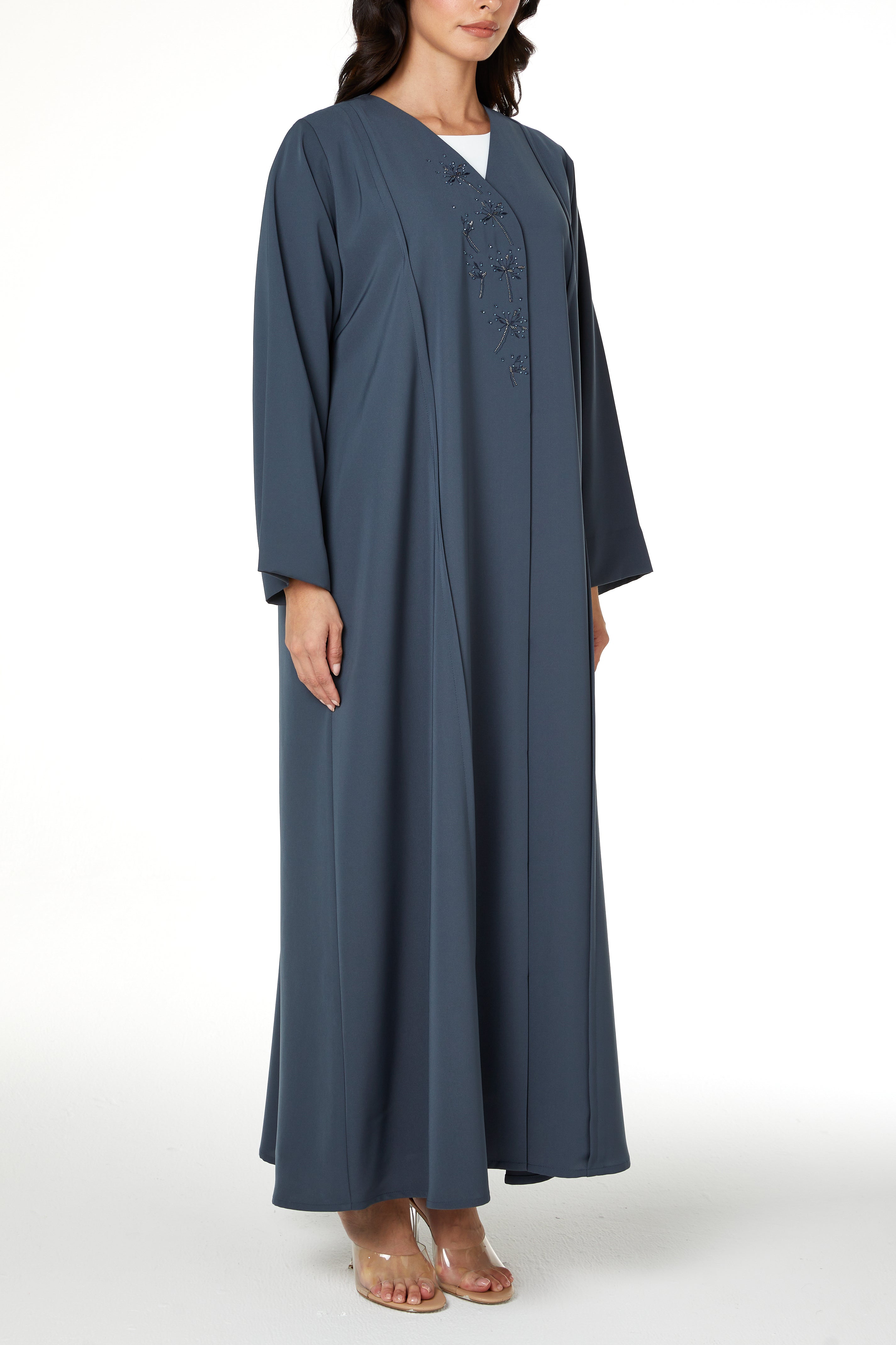 Delicate beadwork is placed along the front panel near the neckline, arranged in a vertical formation. The beadwork adds subtle visual interest and texture without overpowering the abaya, keeping the look polished and suitable for social gatherings and seasonal occasions.