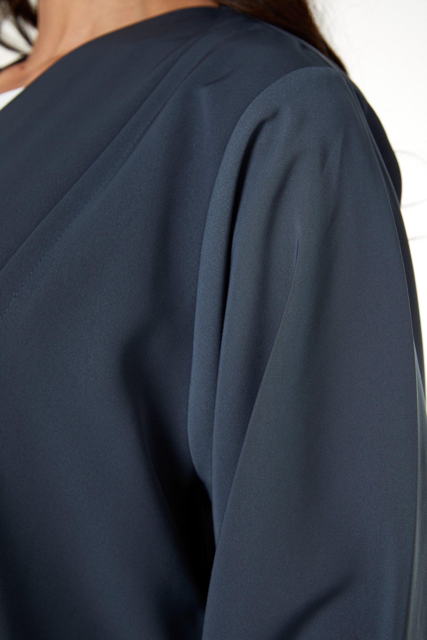 Lio Crepe gives this green abaya a smooth surface with a lightweight and comfortable feel. The fabric is suitable for extended wear and maintains a neat appearance throughout the day. The green color adds a fresh and elegant tone while remaining refined and easy to style.