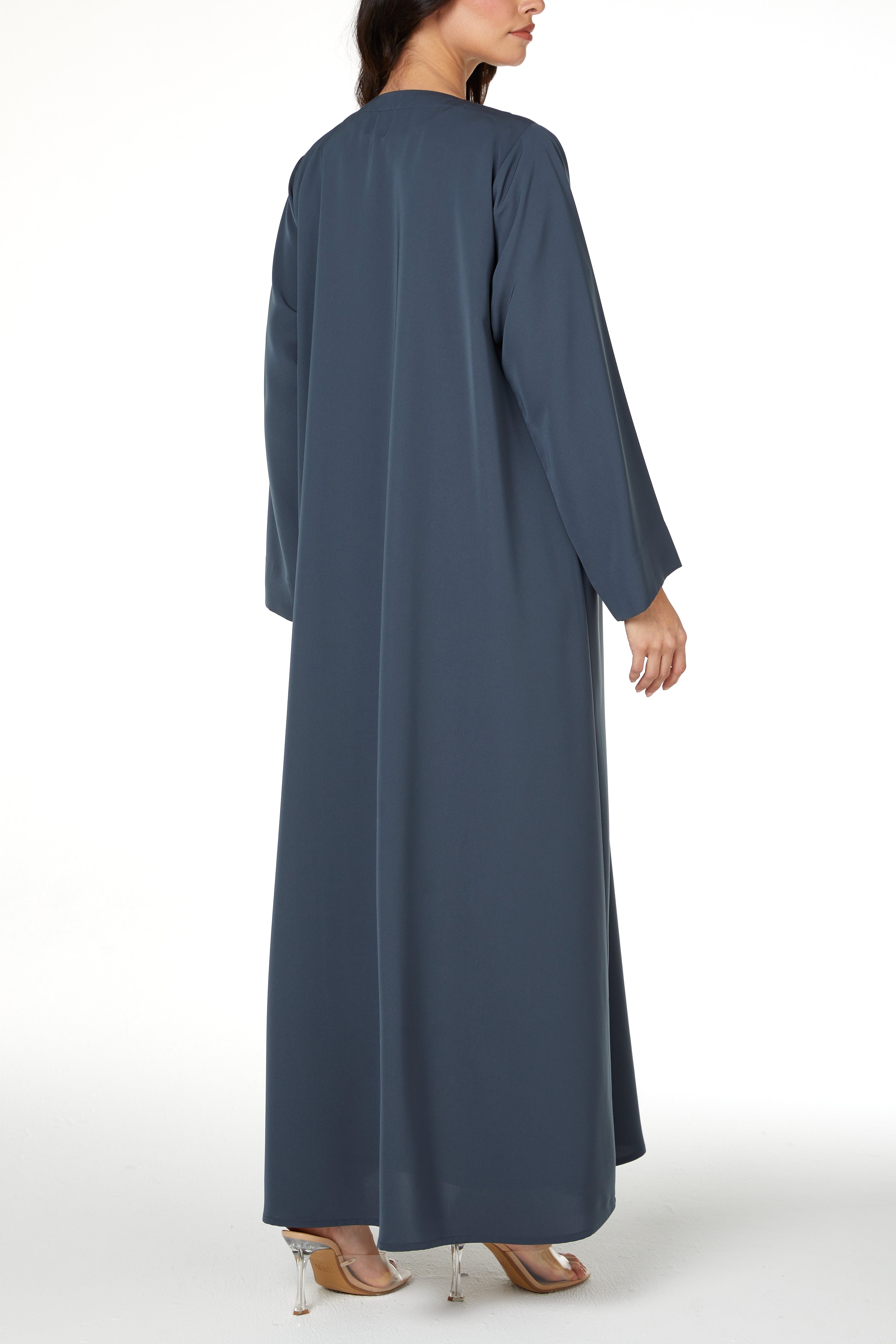 Sleeves are relaxed and neatly finished, ensuring comfort and ease throughout wear. This abaya offers a balanced combination of practicality and detail, making it appropriate for both daytime and evening settings.