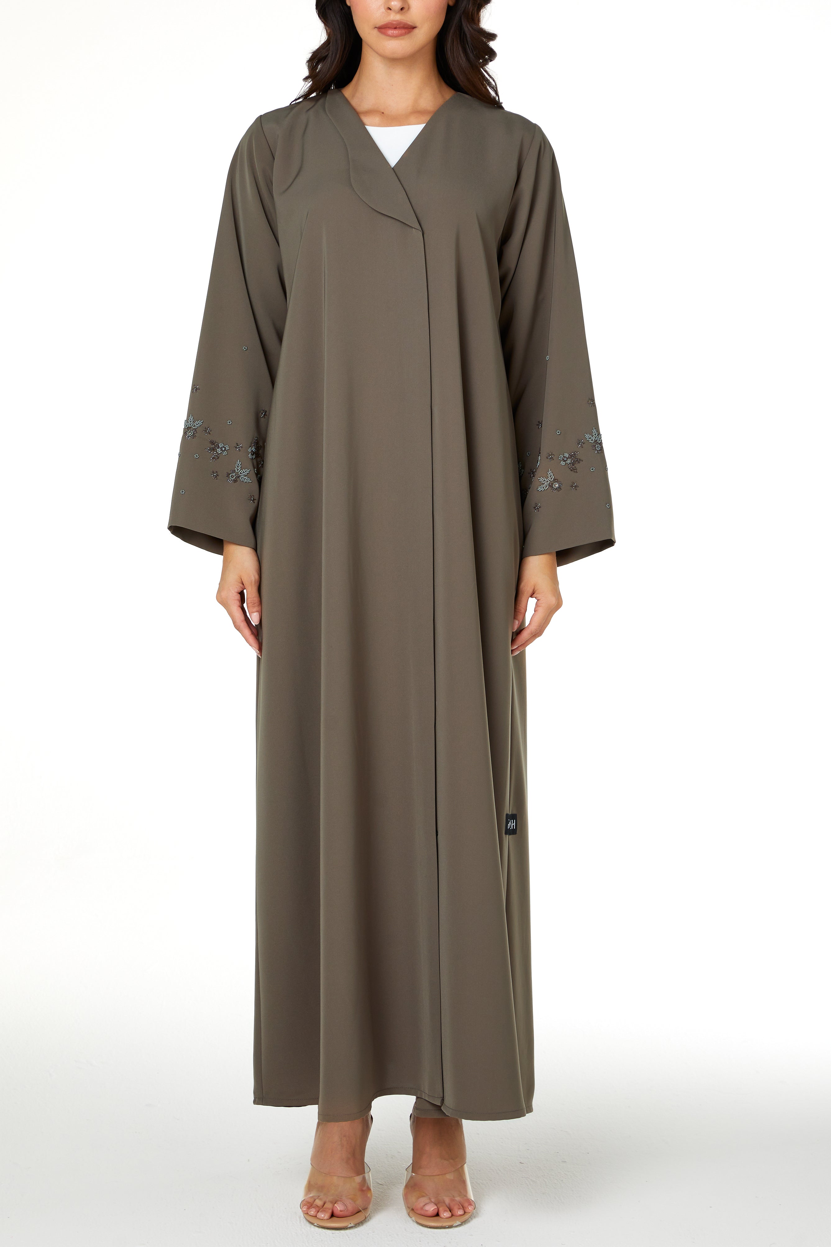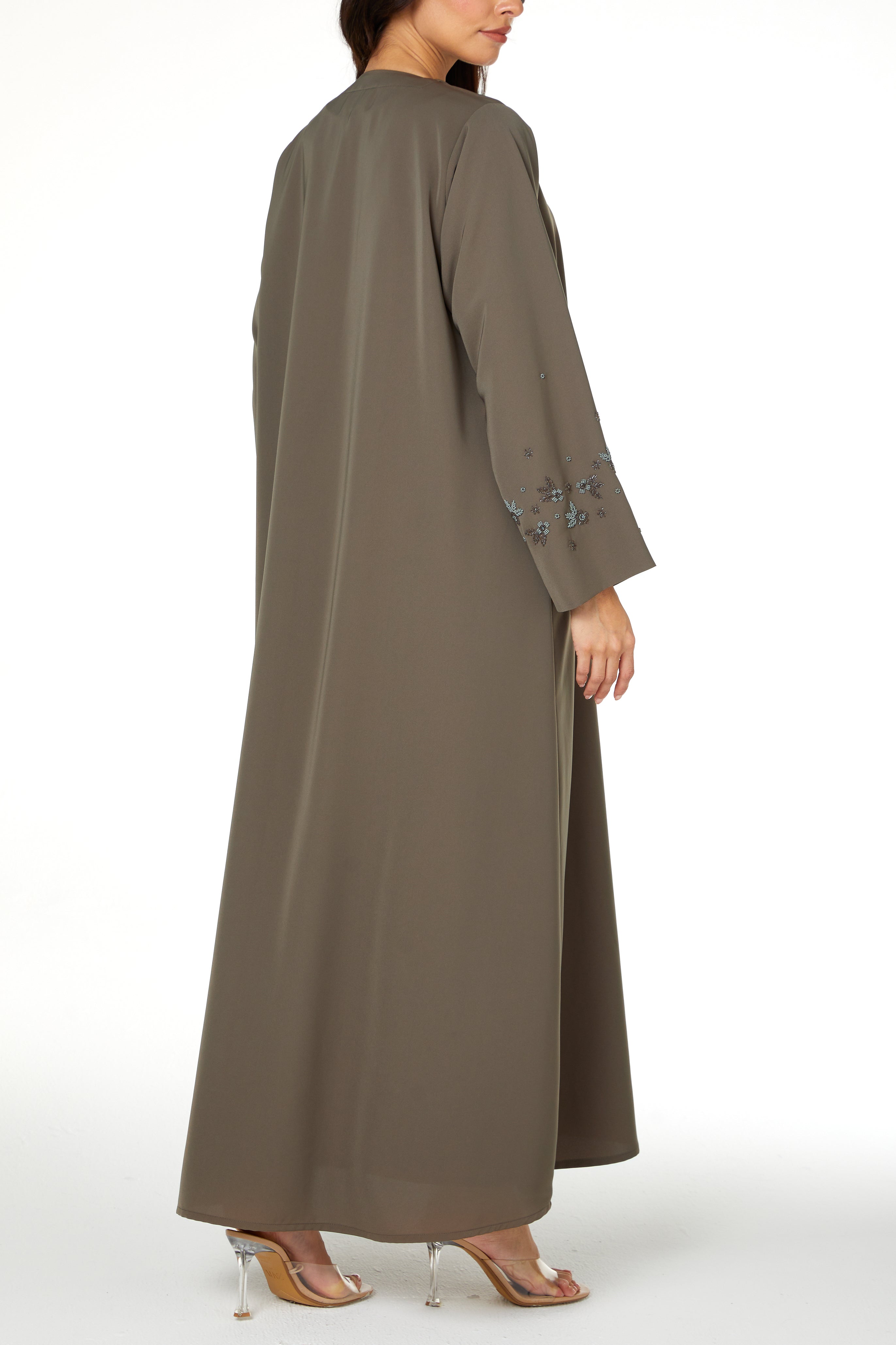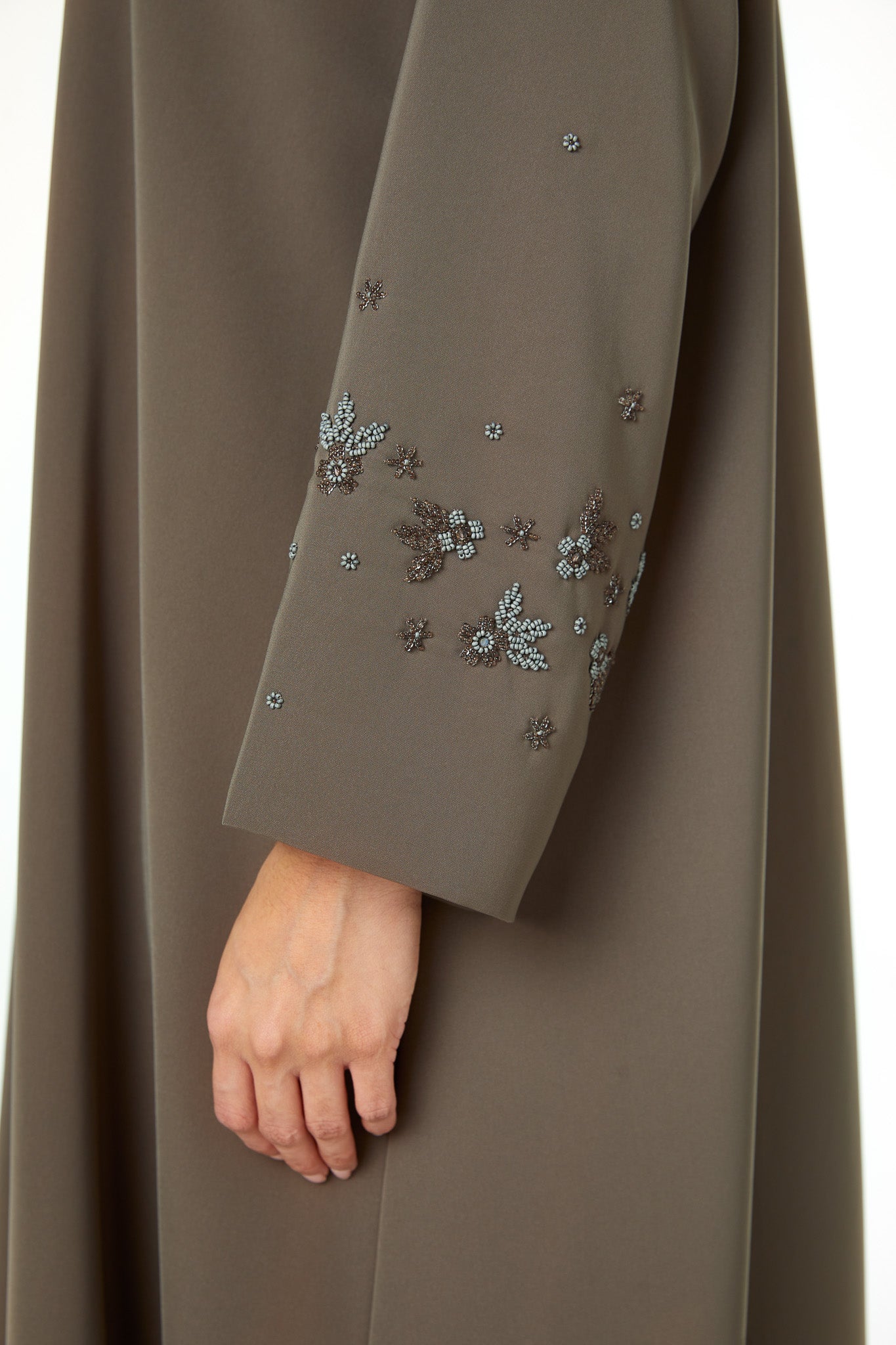 Delicate beadwork is applied along the lower portion of the sleeves. The bead placement adds texture and visual interest while maintaining a polished and balanced appearance. The detailing enhances the abaya without overpowering the overall design, making it suitable for both work and social settings.