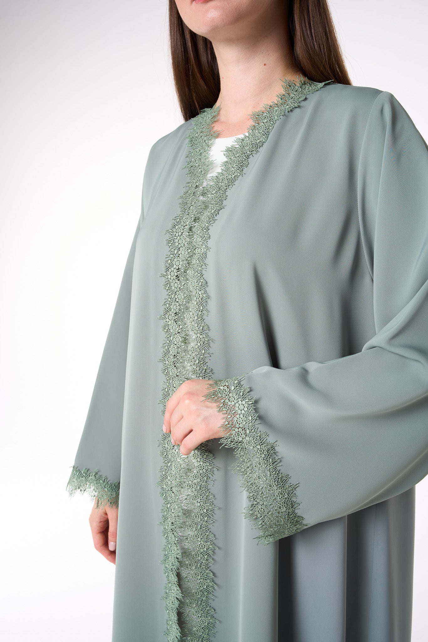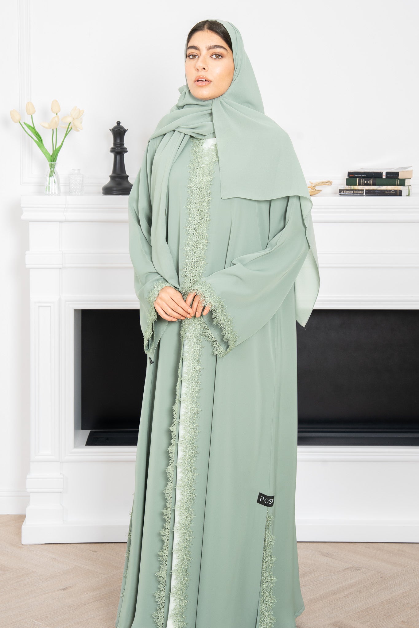 This green abaya is tailored from lightweight Reem Nada fabric and designed in a classic KLOSH cut, which offers a softly flared shape from the waist down. Tone-on-tone lacework is delicately applied along the sleeve and shoulder panels, adding refined detail while keeping the overall look clean and modest.