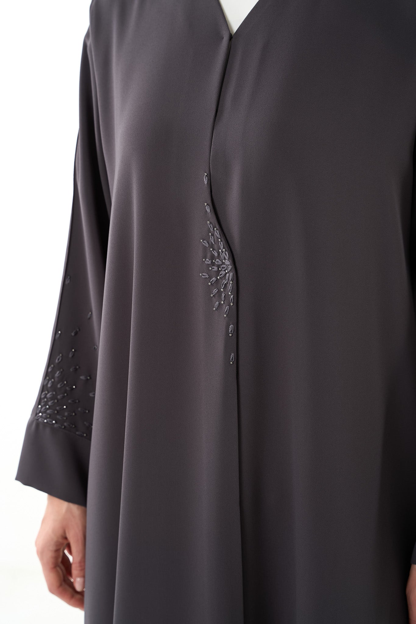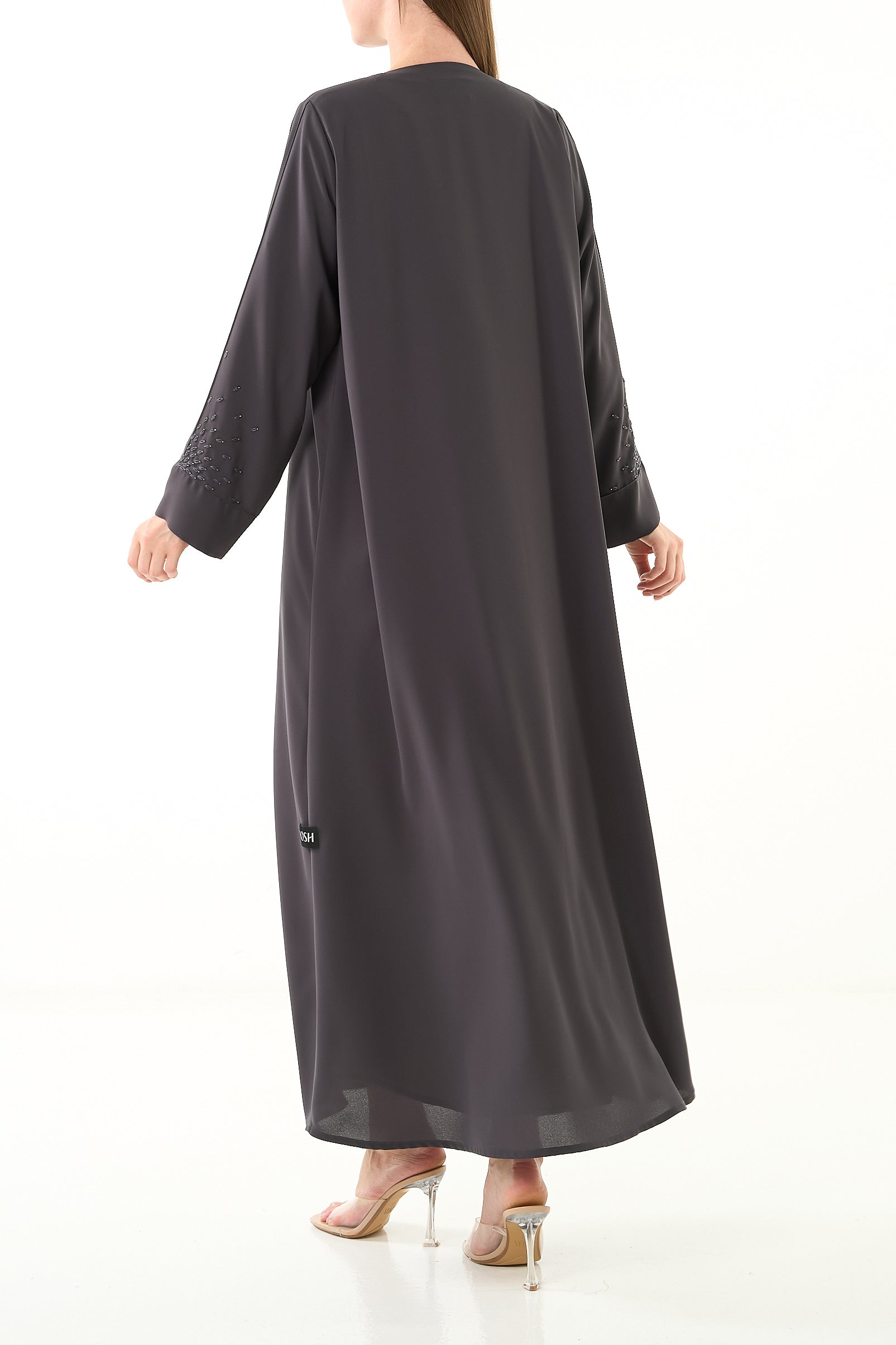Grey Claire Crepe Abaya with Klosh Cut and Minimal Beadwork