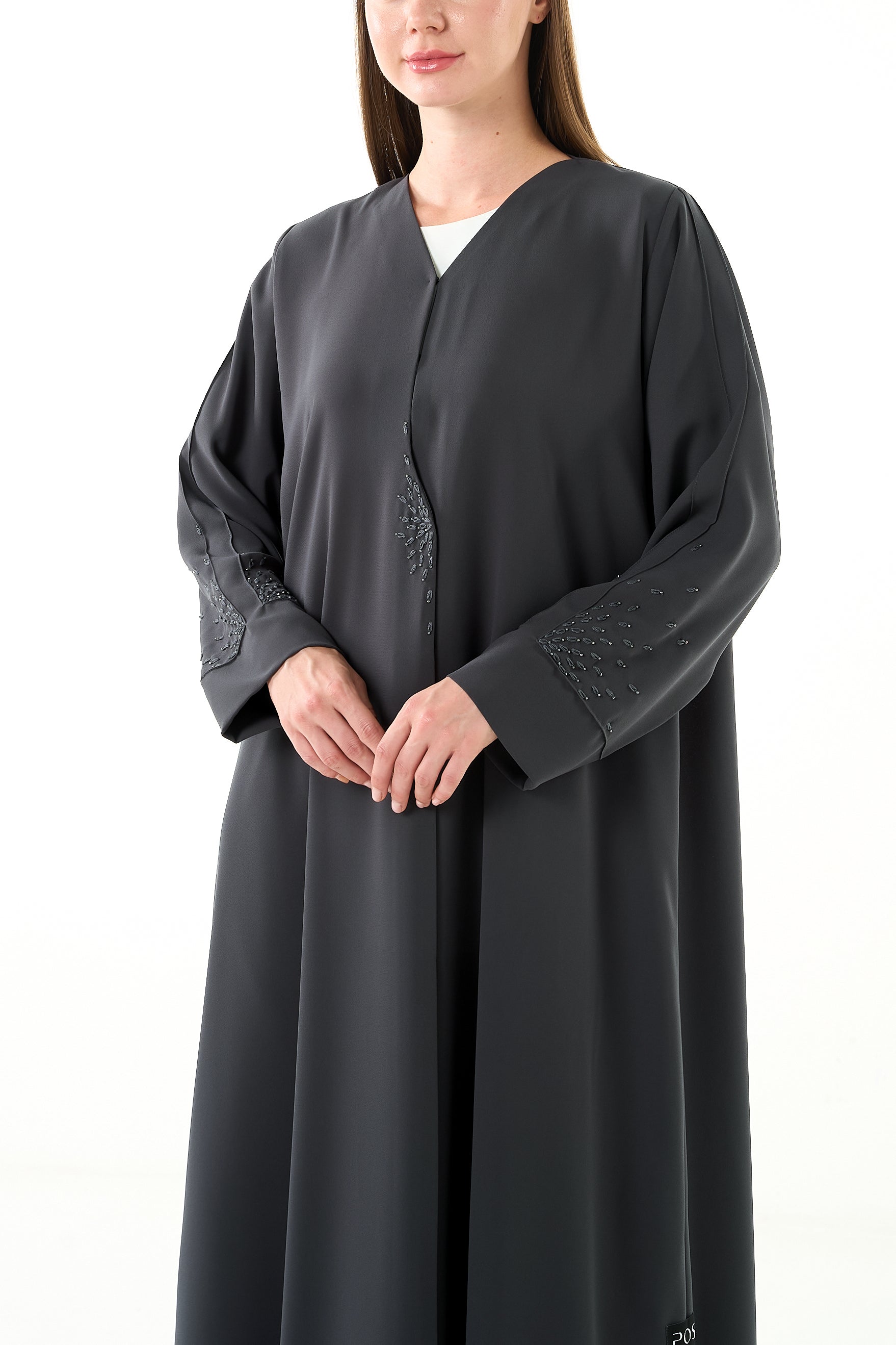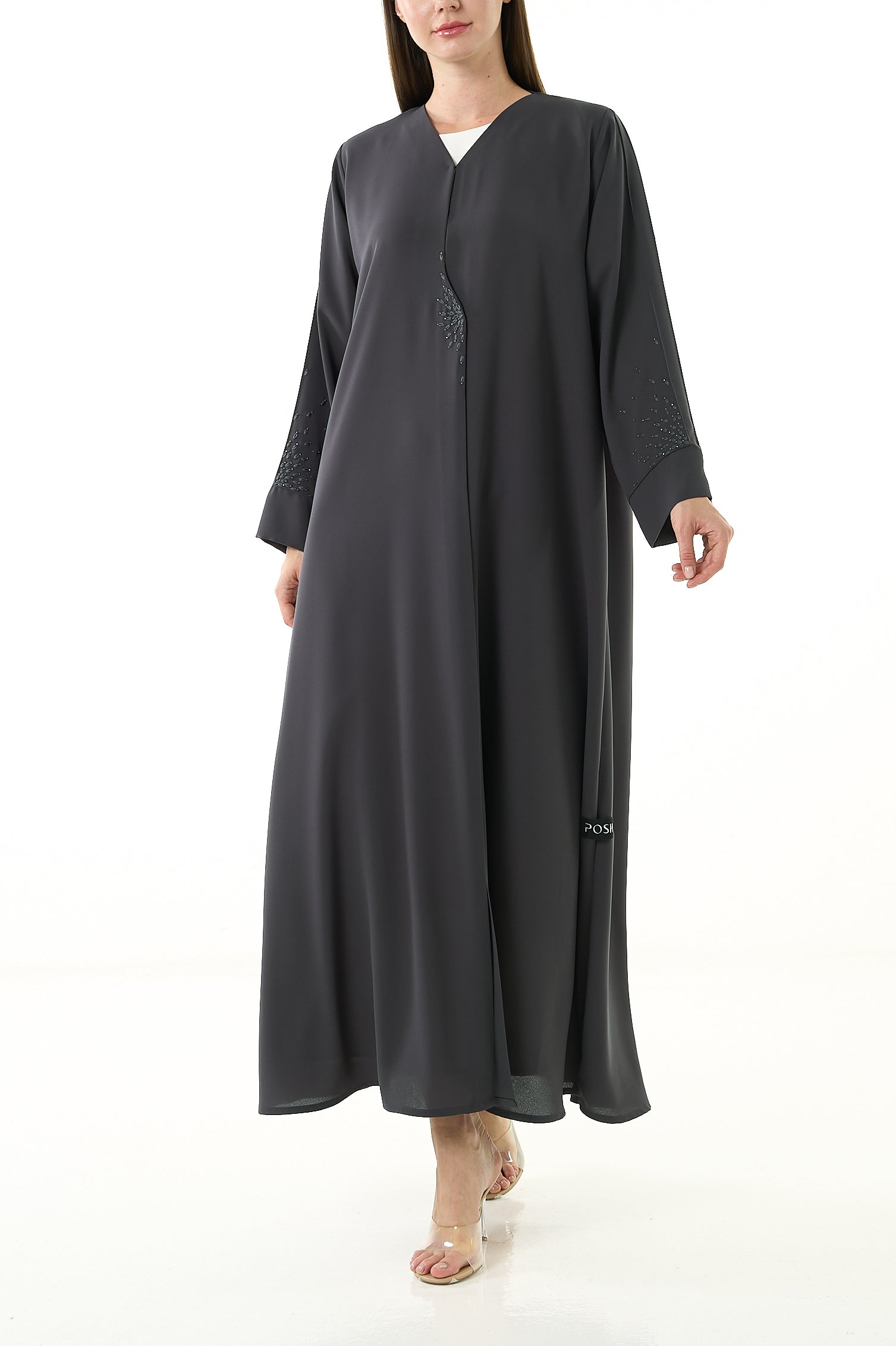 This grey abaya is tailored from Claire Crepe, a medium-weight fabric chosen for its breathable comfort and soft structure. It provides full coverage and a composed silhouette for modest, refined dressing.