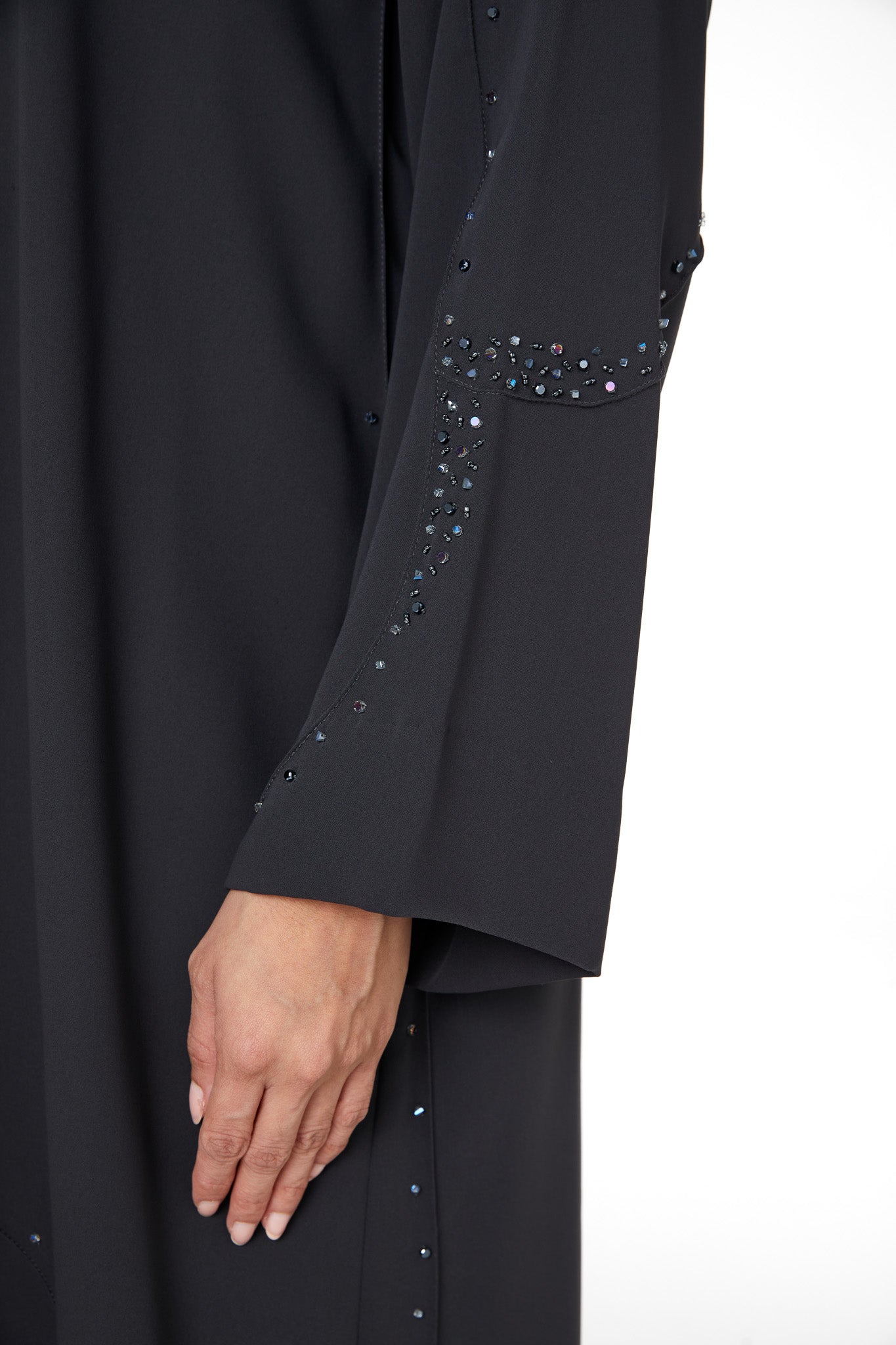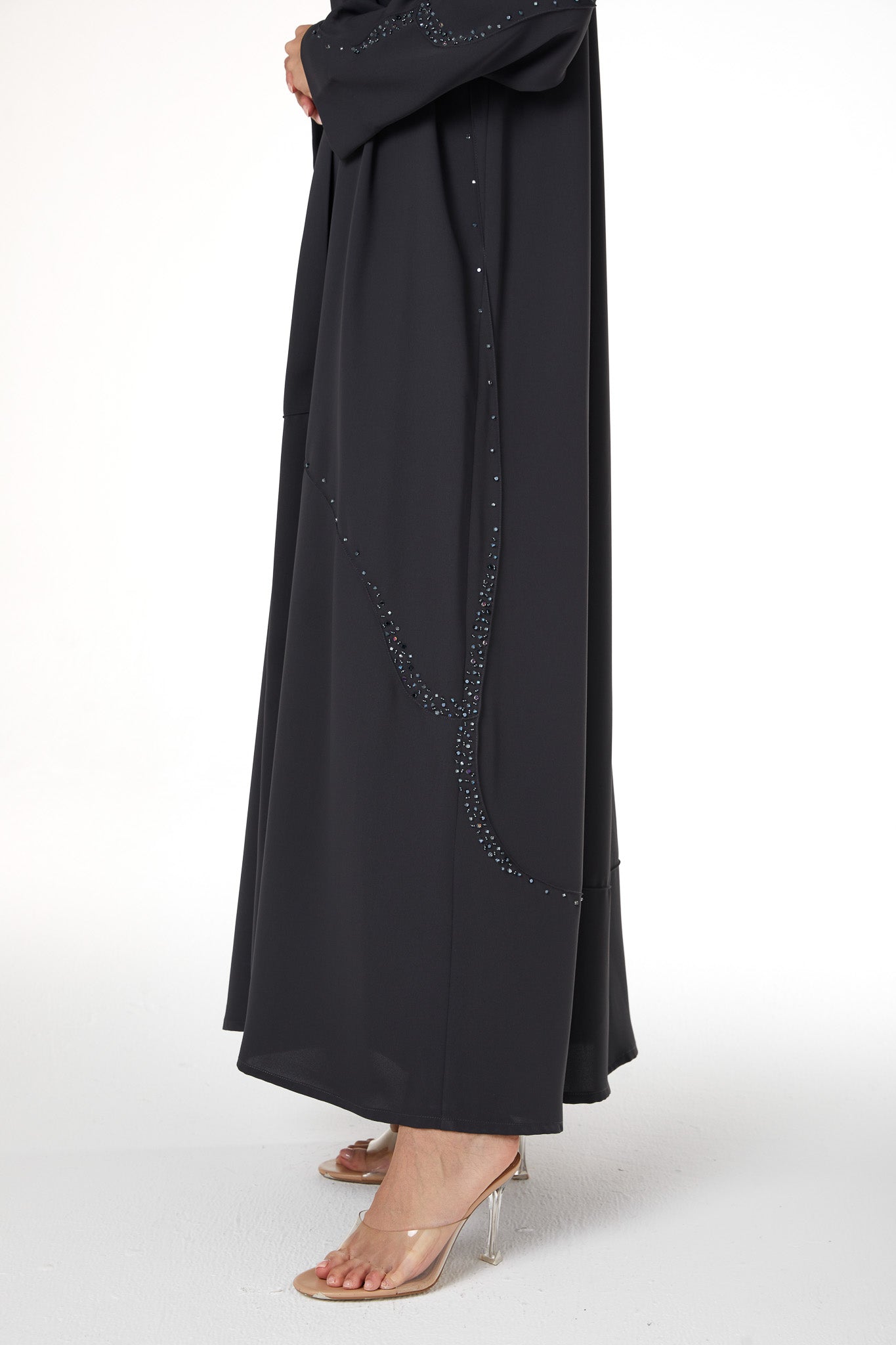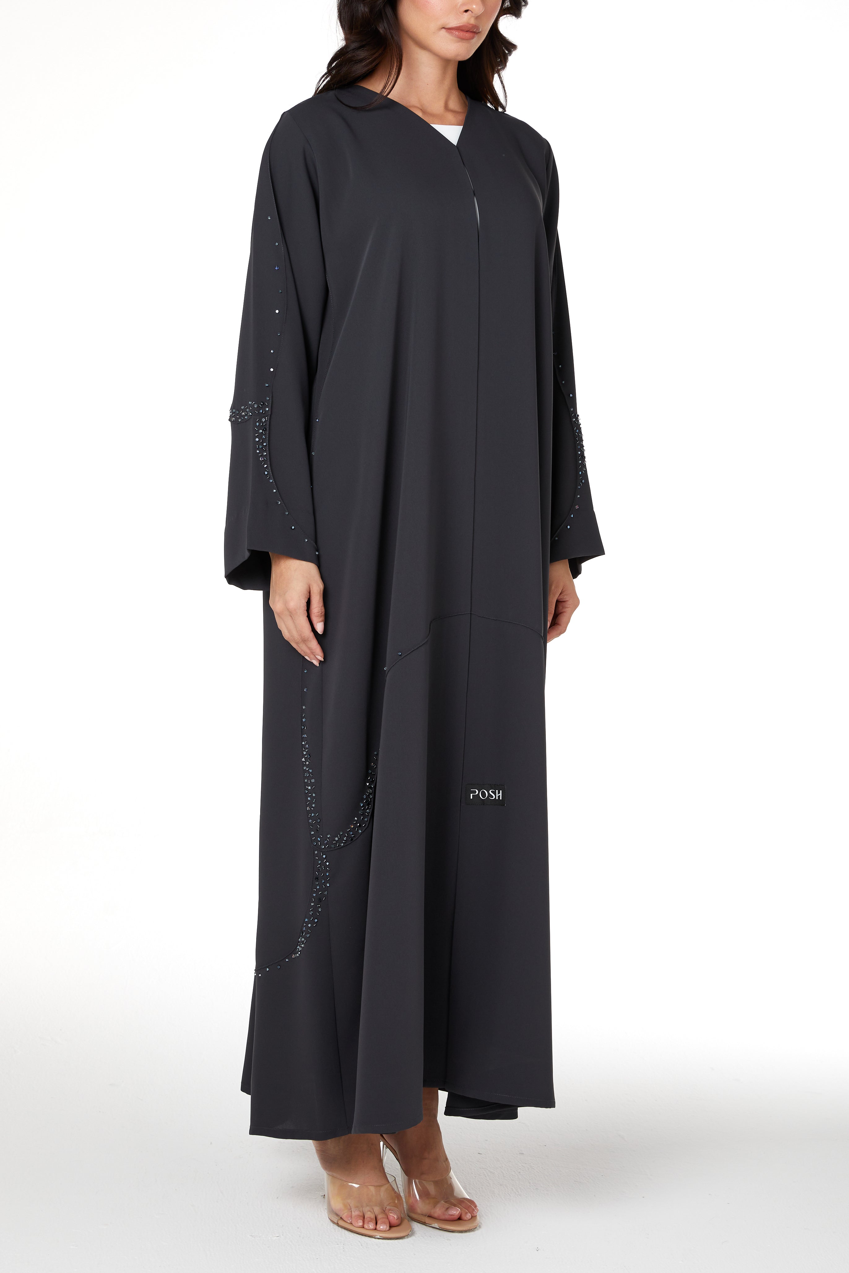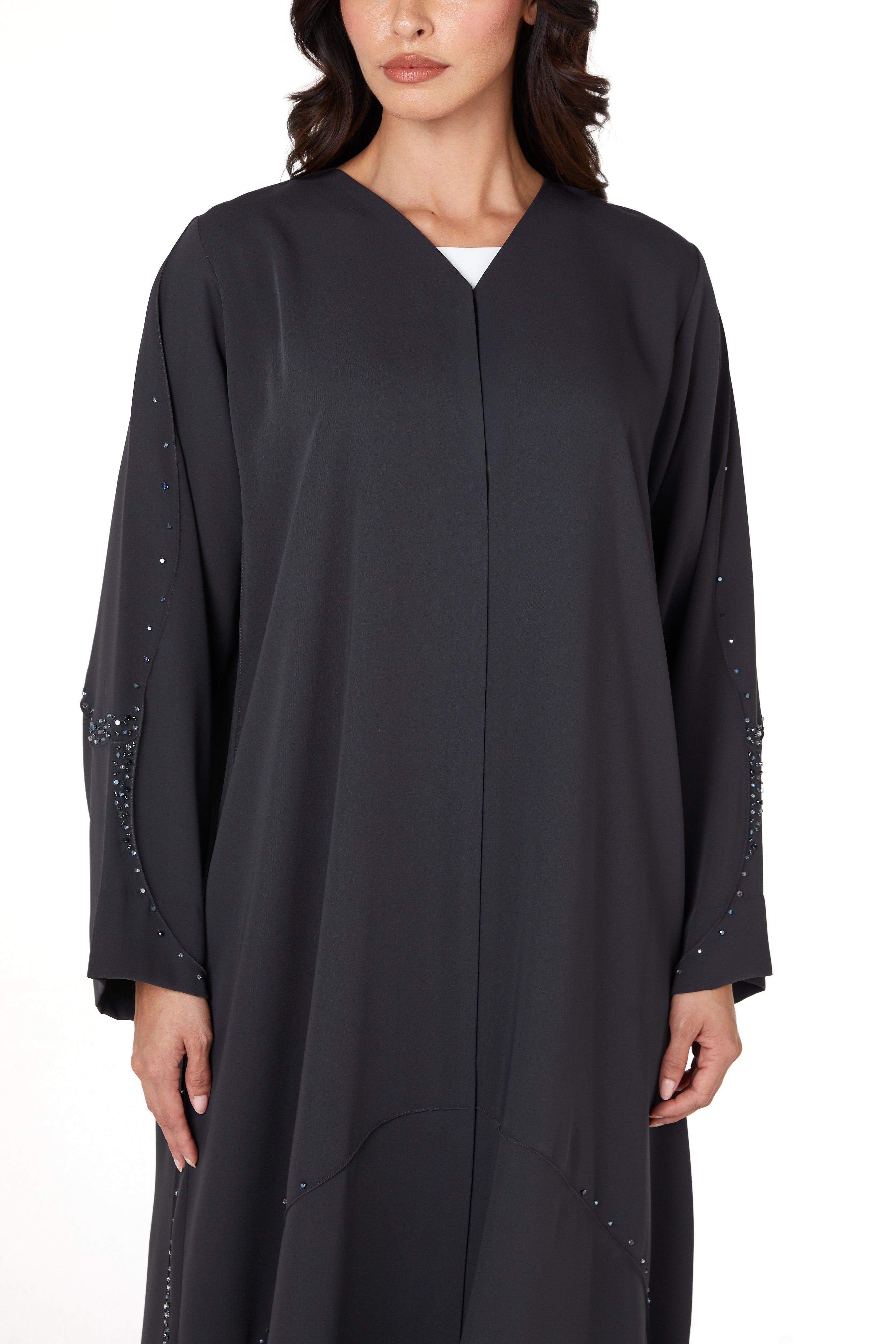 A curved panel is placed along the lower body and sleeves, outlined with scattered beadwork that catches light in a subtle, delicate way. The beading follows the curve to create a graceful line without overpowering the simplicity of the abaya. The neckline is kept clean and minimal, and the hem is neatly top-stitched as shown in the garment reference images on page 1 and page 9 of your techpack