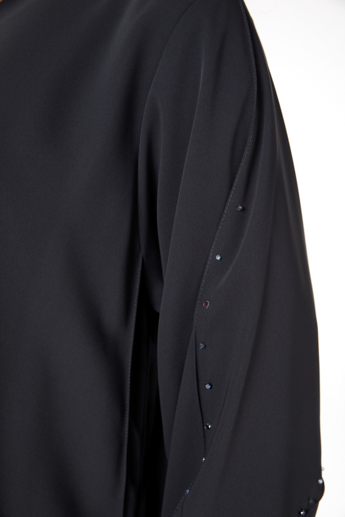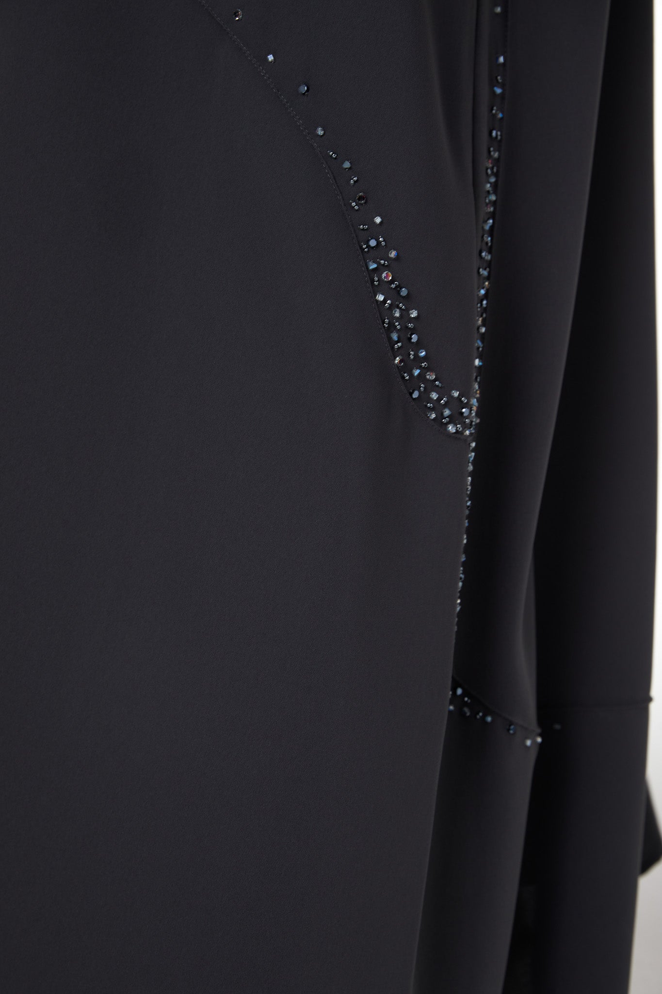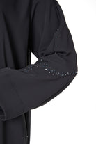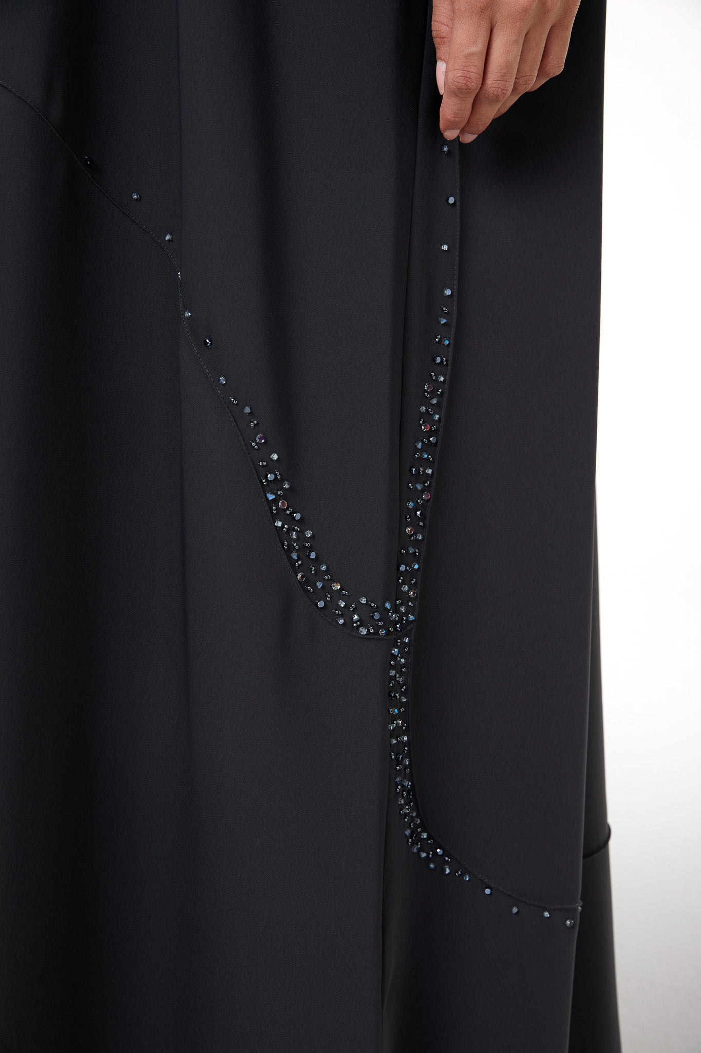 A curved panel is placed along the lower body and sleeves, outlined with scattered beadwork that catches light in a subtle, delicate way. The beading follows the curve to create a graceful line without overpowering the simplicity of the abaya. The neckline is kept clean and minimal, and the hem is neatly top-stitched as shown in the garment reference images on page 1 and page 9 of your techpack