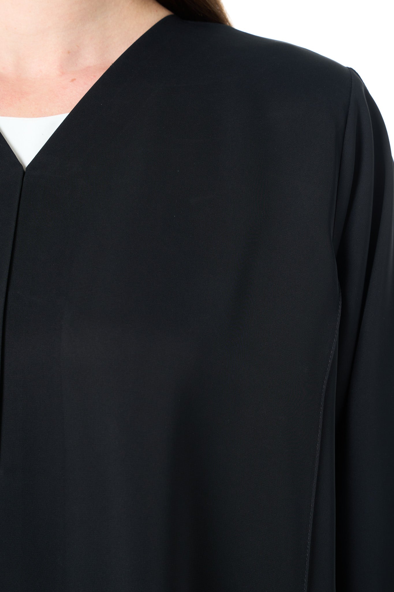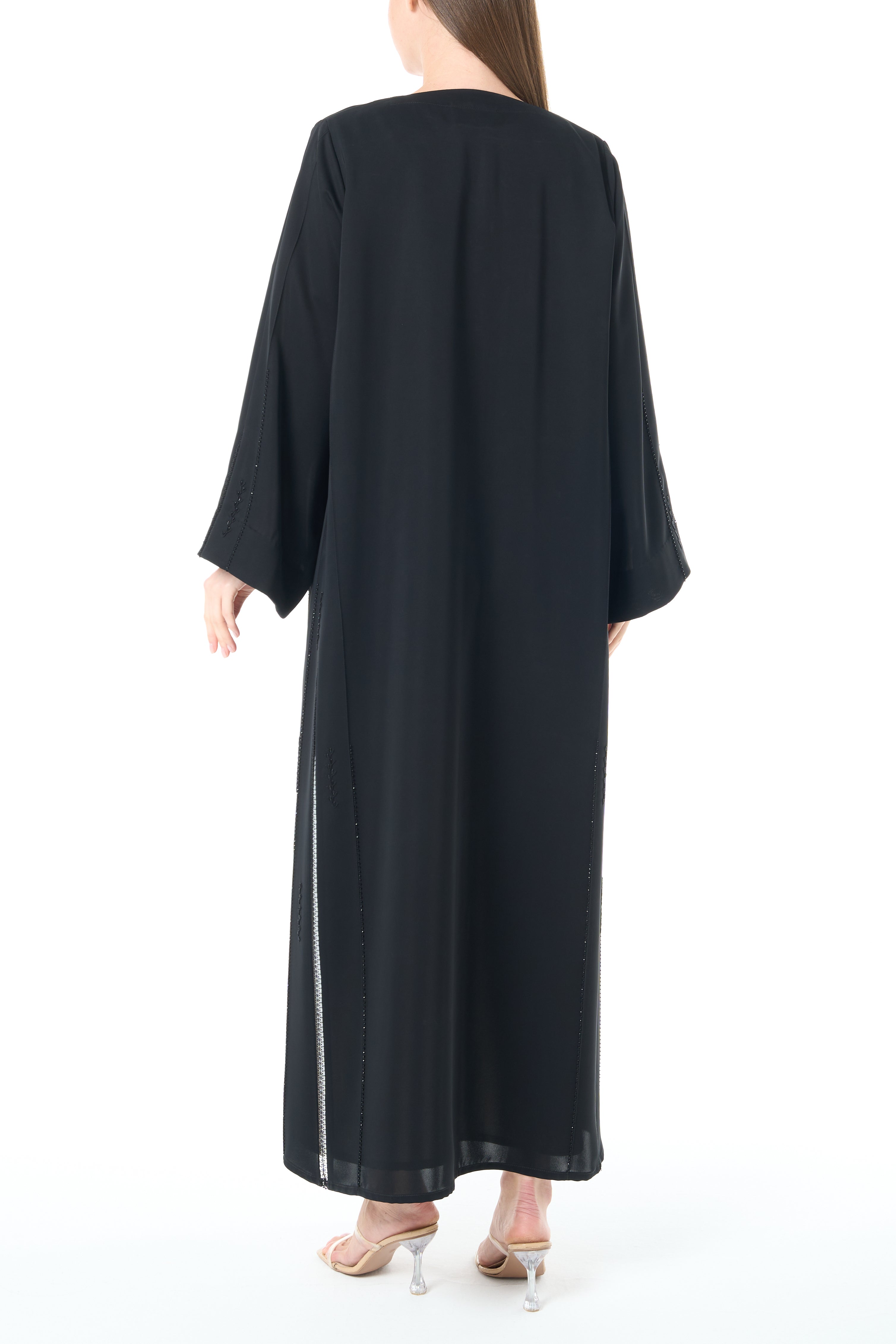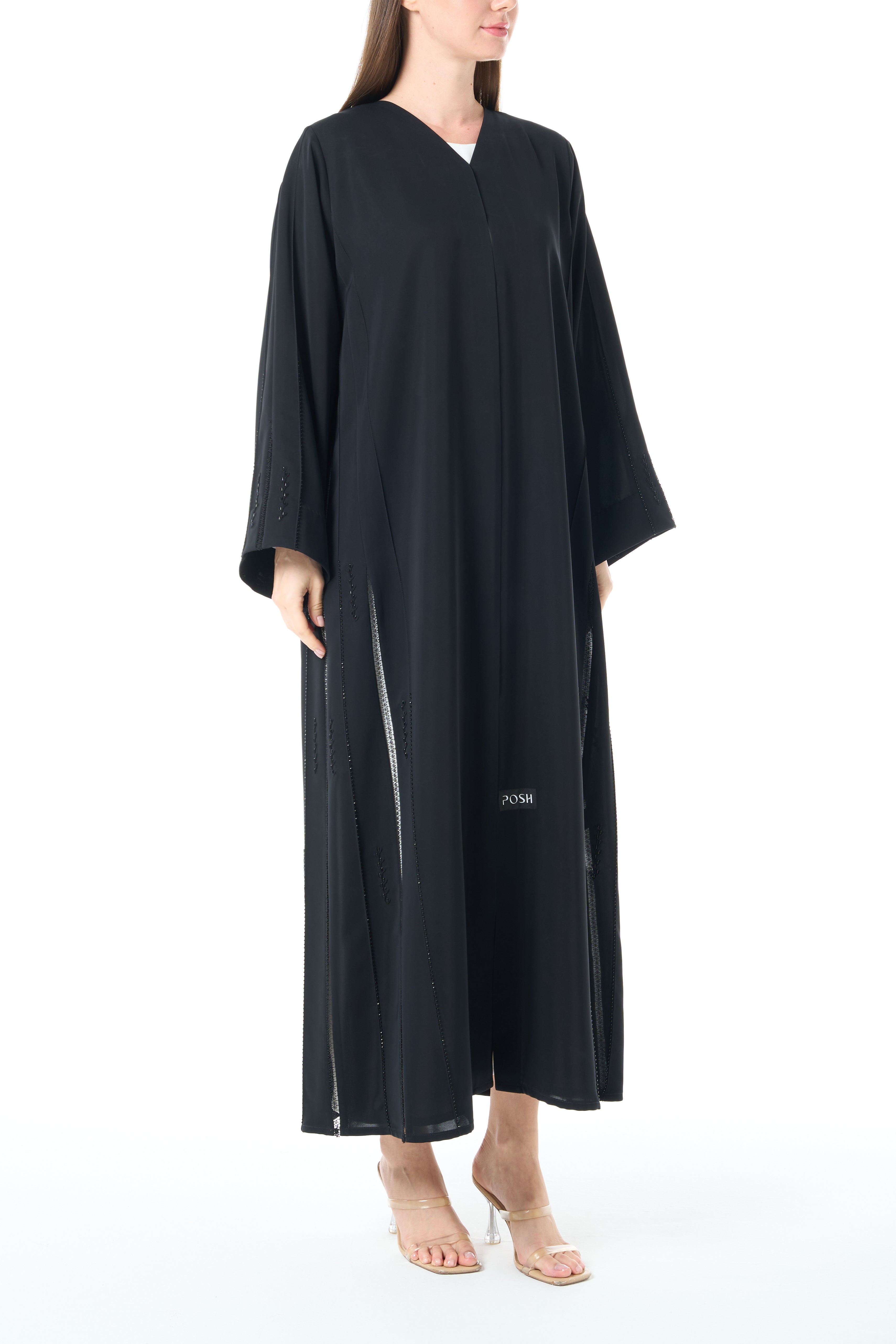This jet black abaya is tailored in breathable Reem Nada fabric, known for its smooth finish and soft structure. Designed in a flowing KLOSH silhouette, it features delicate lacework starting at the shoulders and extending seamlessly along the front. The sleeves are finished with tyre-style embroidery, adding subtle texture without taking away from the clean look. A modest V neckline ensures comfort and coverage.