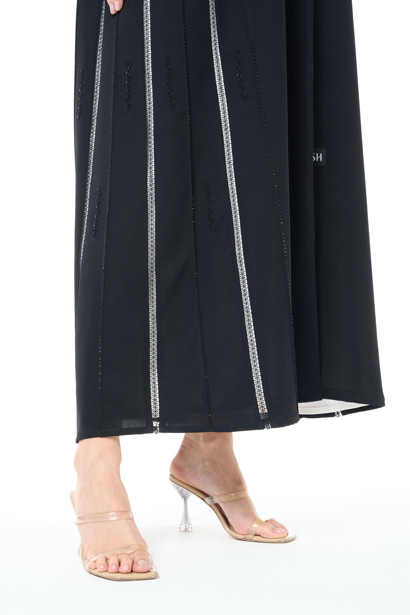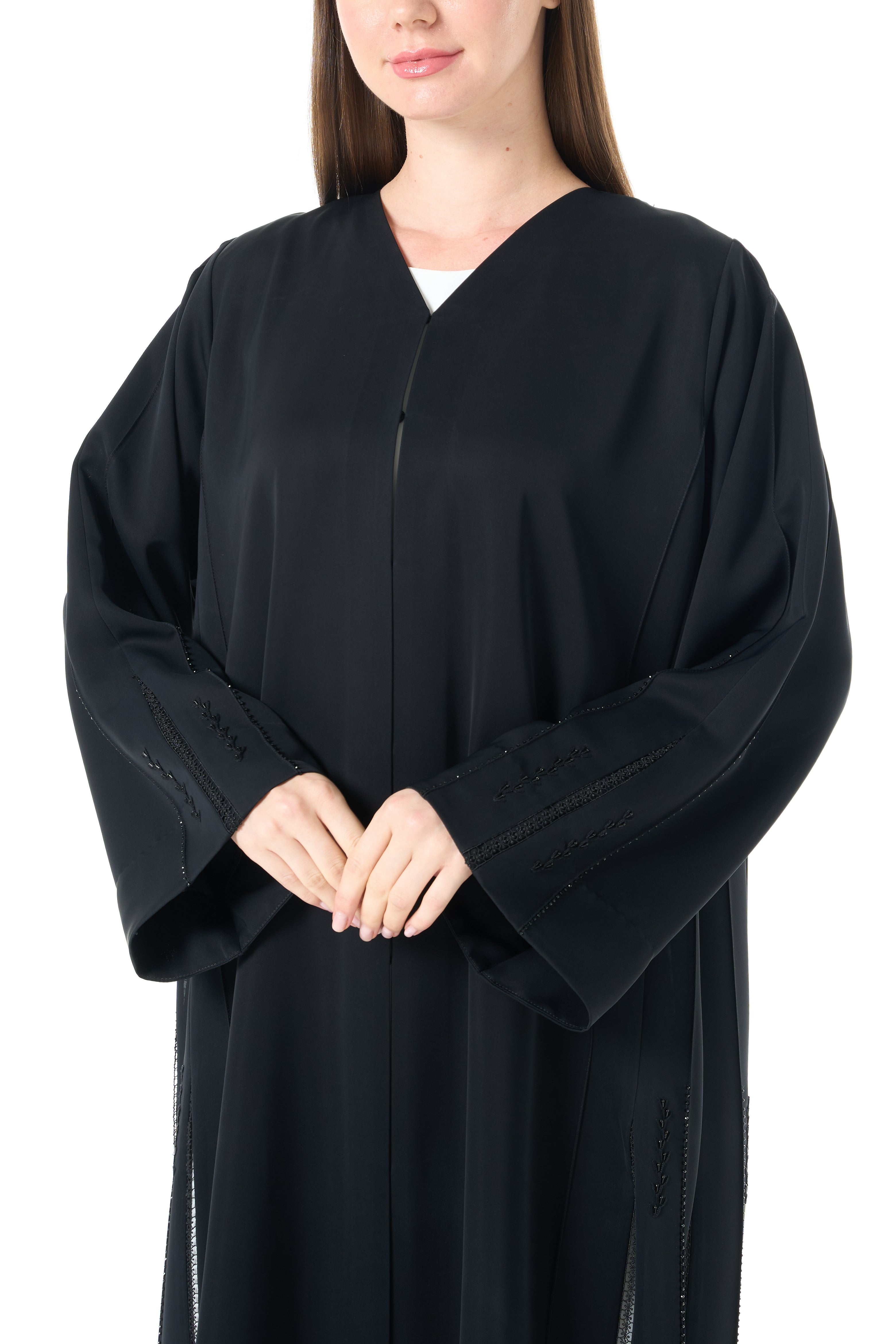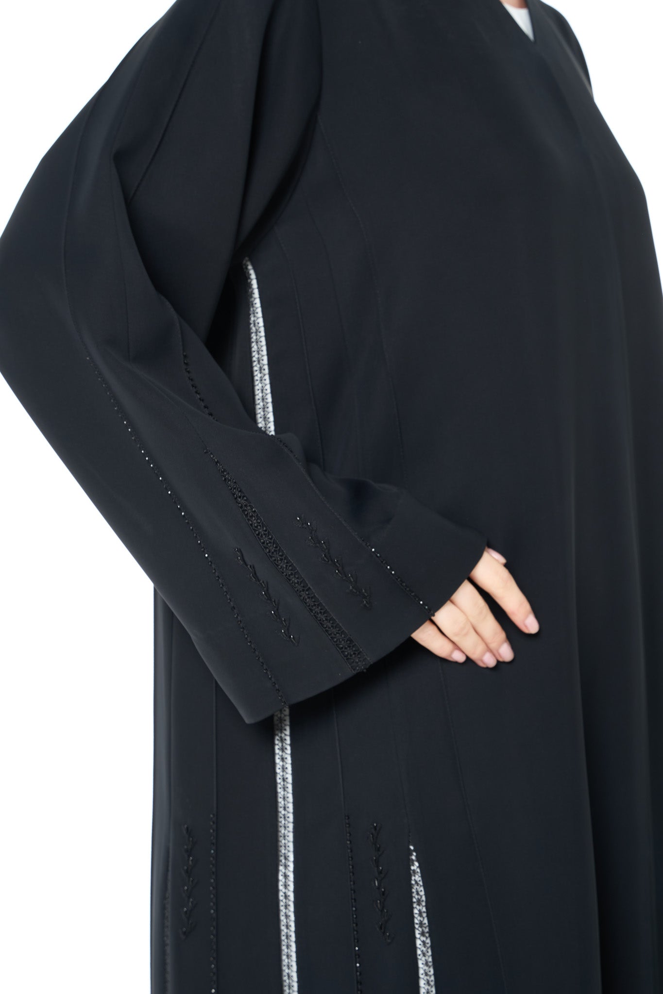 Jet Black Reem Nada Abaya with Shoulder Lace and Sleeve Tyre Detail
