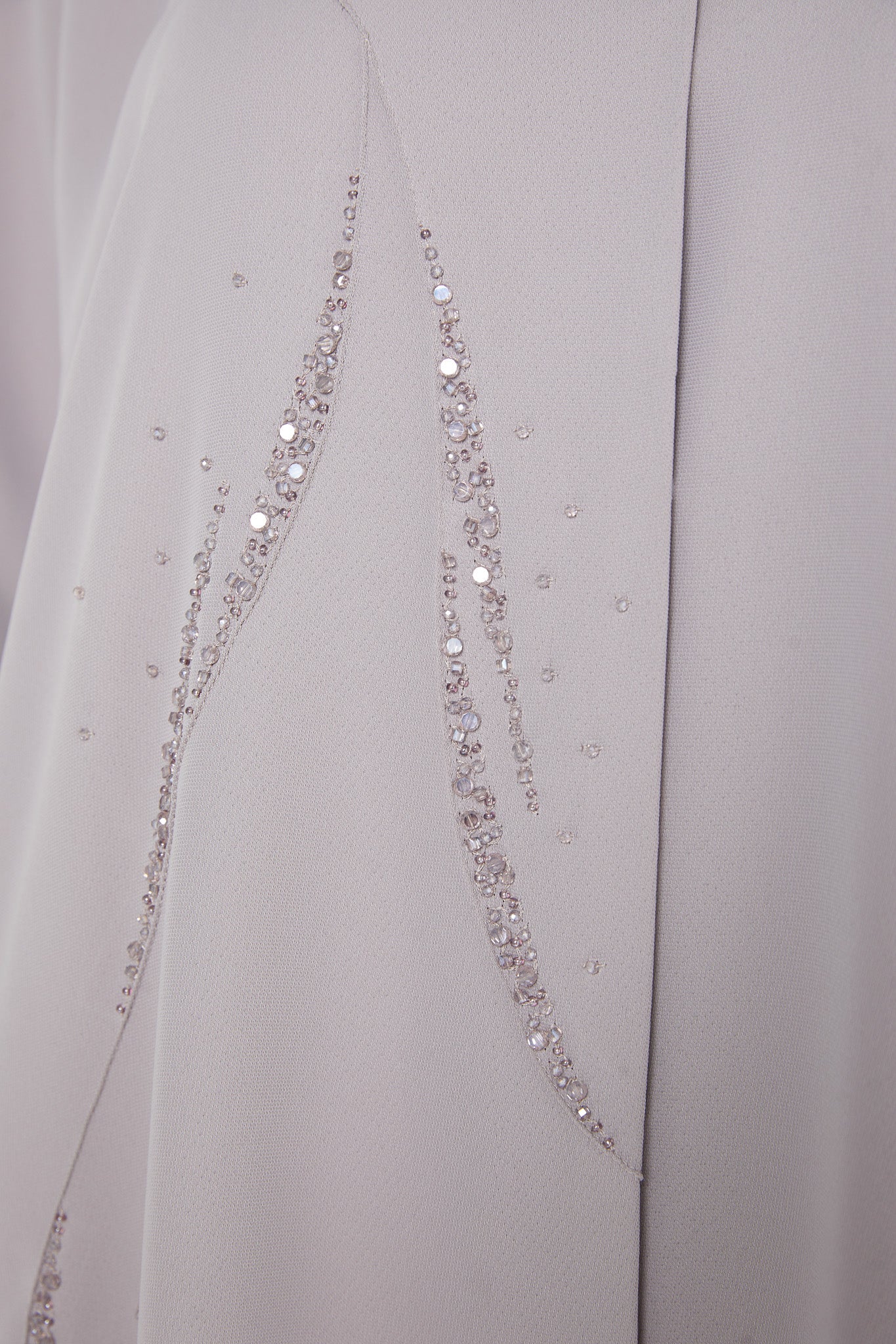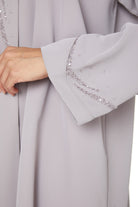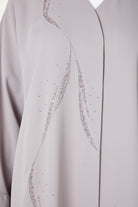 Beadwork is placed along the centre front, creating a decorative focal point that enhances the design without overpowering the silhouette. Front pintuck detailing adds structure and subtle texture, giving the abaya a composed and well-finished look.