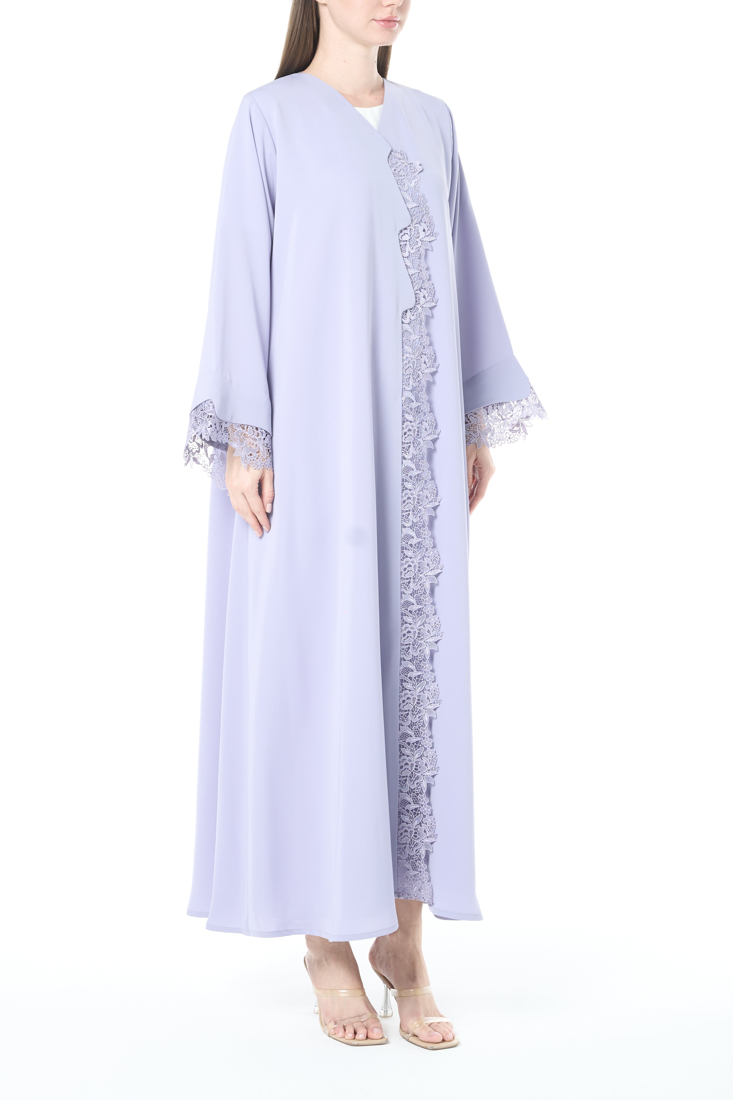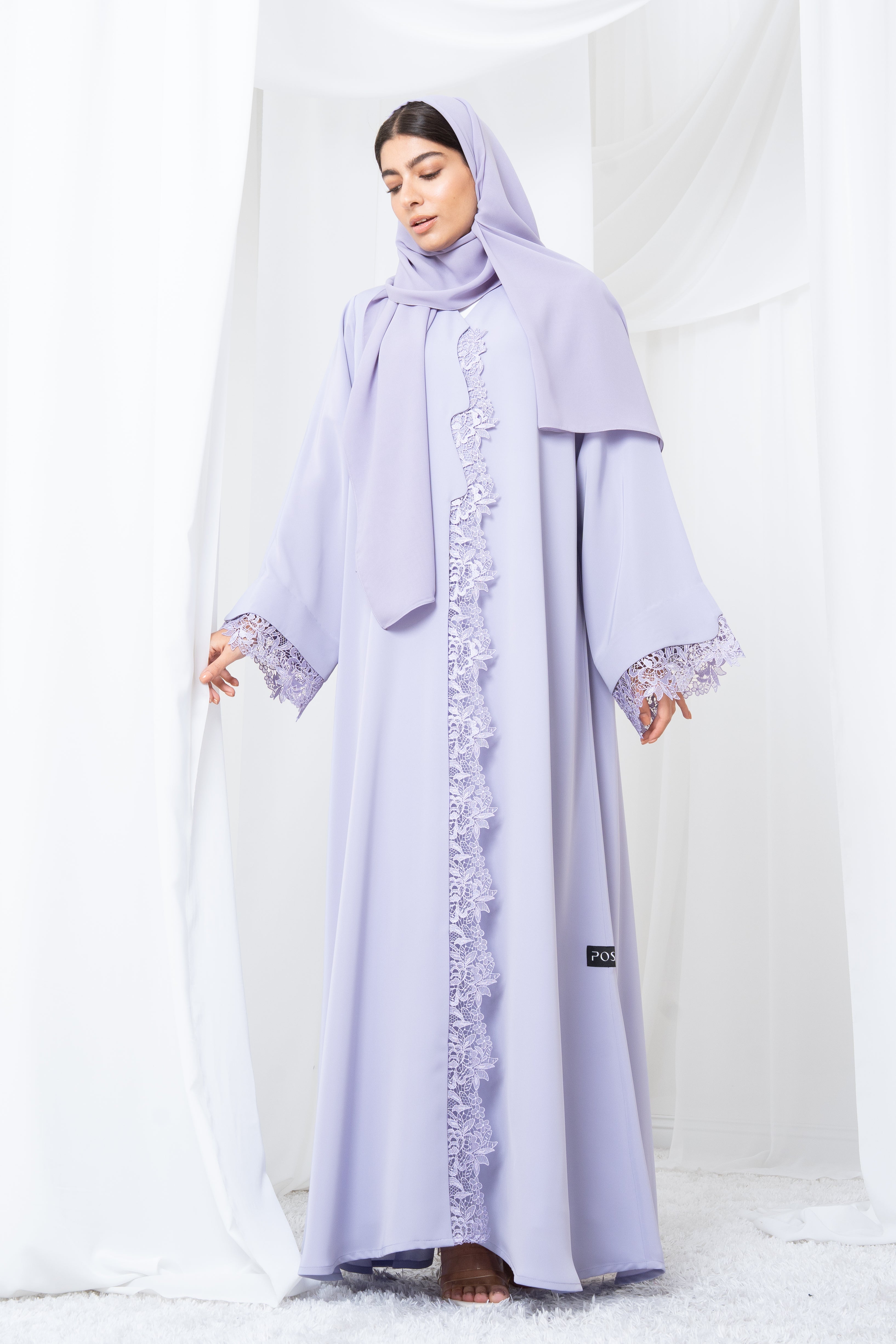 This purple abaya is made from soft Classic Nada fabric, tailored in a KLOSH cut that creates a subtle flare from the waist for natural movement and elegant modesty. The neckline features a neat V-shape and is carefully topstitched for structure and polish. Along the front and sleeves, delicate white lace—custom-dyed to match the purple base—adds quiet contrast without overwhelming the garment’s simplicity.